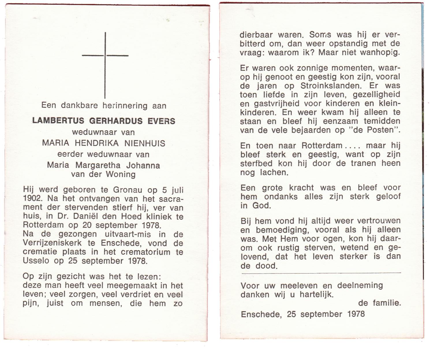 EVERS, Lambertus Gerhardus, geboren op 5-7-1902 te Gronau (Dld.), overleden op 20-9-1978 te Rotterdam op 77-jarige leeftijd, gecremeerd op 25-9-1978 te Usselo.