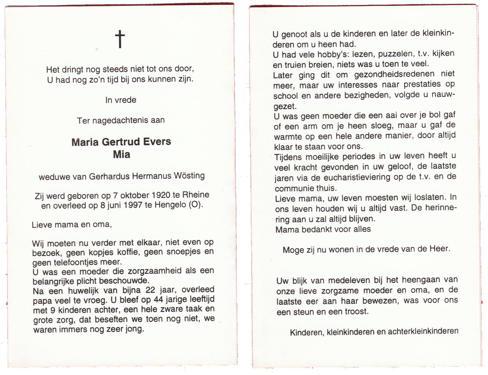 EVERS, Maria Gertrud (Mia), geboren op 7-10-1920 te Rheine (Dld.), overleden op 8-6-1997 te Hengelo (Ov.) op 76-jarige leeftijd.