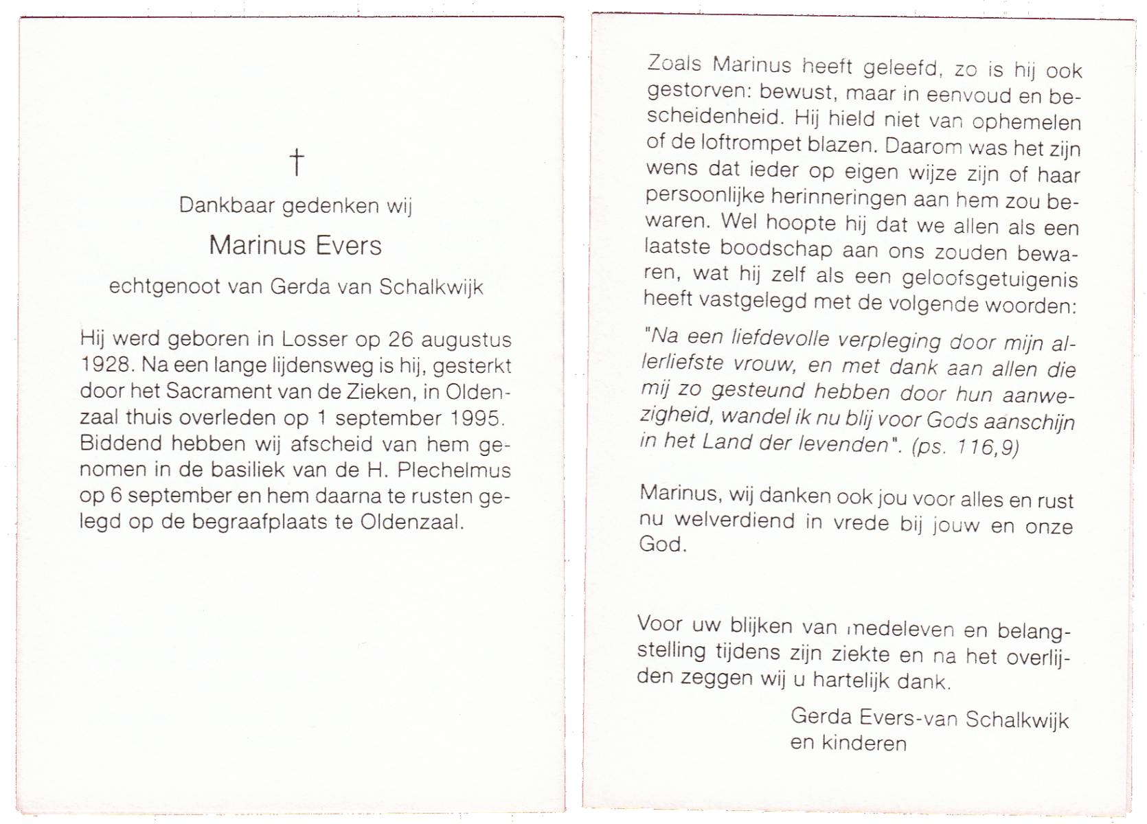 EVERS, Marinus, geboren op 26-8-1928 te Losser, overleden op 1-9-1995 te Oldenzaal op 67-jarige leeftijd, begraven op 6-9-1995 te Oldenzaal.