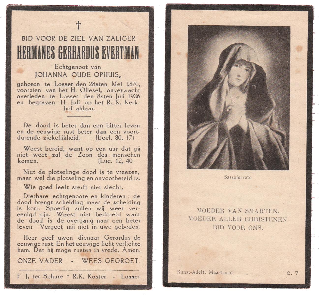 EVERTMAN, Hermanes Gerhardus, geboren op 28-05-1870 te Losser, overleden op 8-7-1936 te Losser op 66-jarige leeftijd, begraven op 11-7-1936 te Losser.