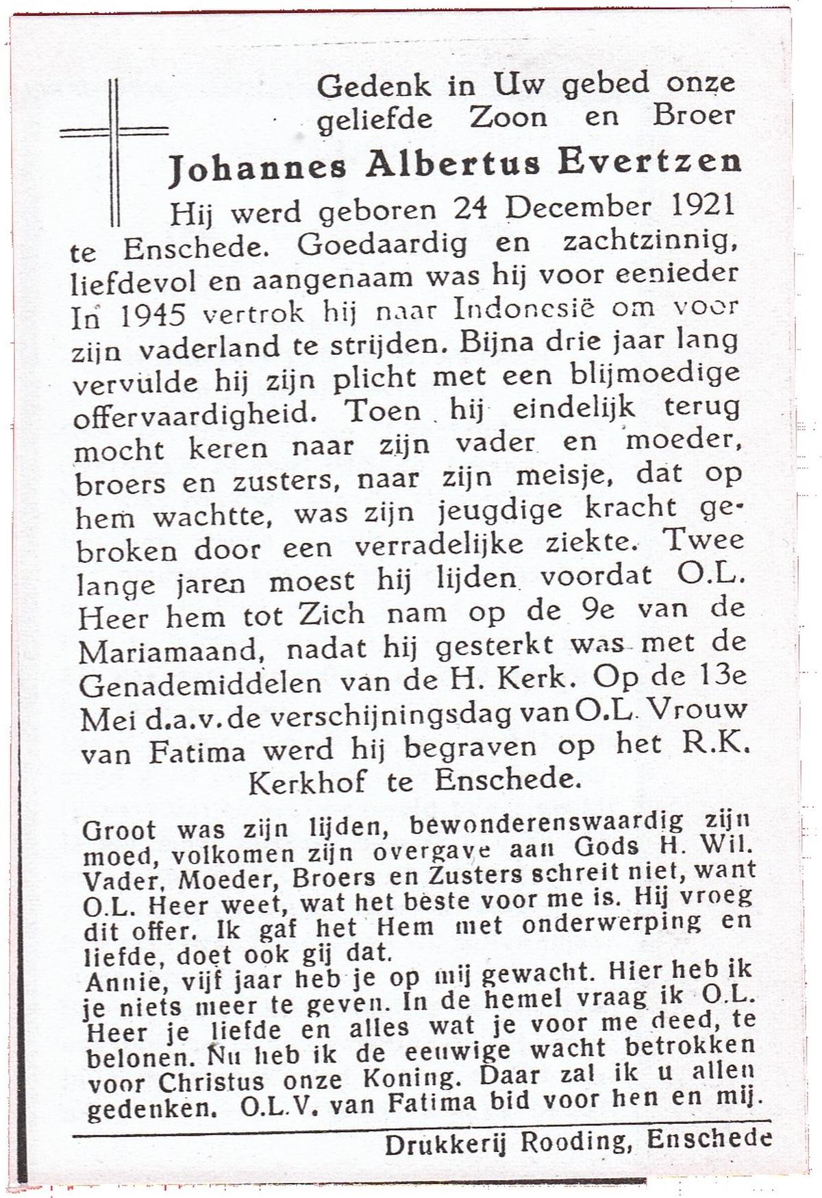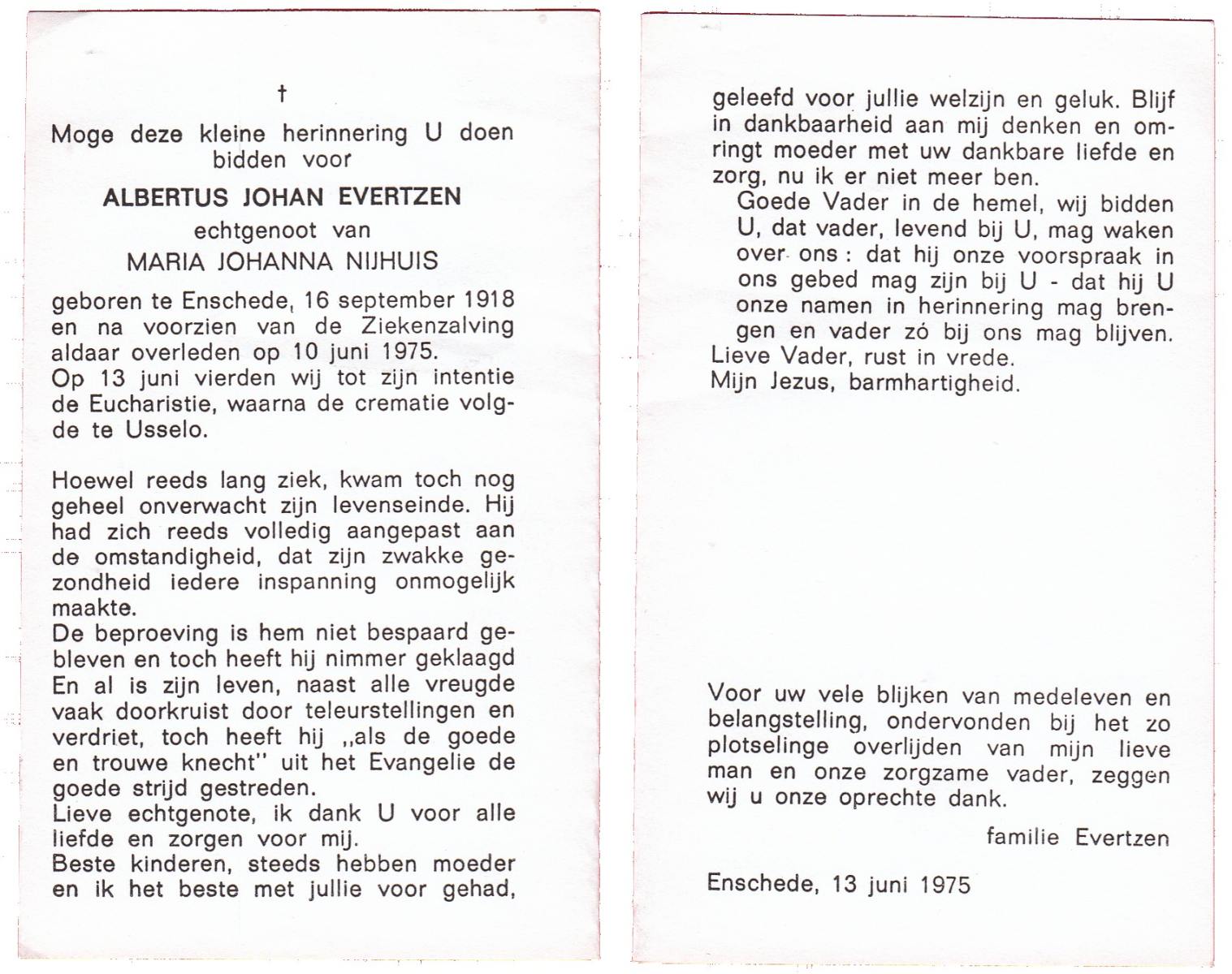 EVERTZEN, Albertus Johan, geboren op 16-9-1918 te Enschede, overleden op 10-6-1975 te Enschede op 56-jarige leeftijd, gecremeerd op 13-6-1975 te Usselo.