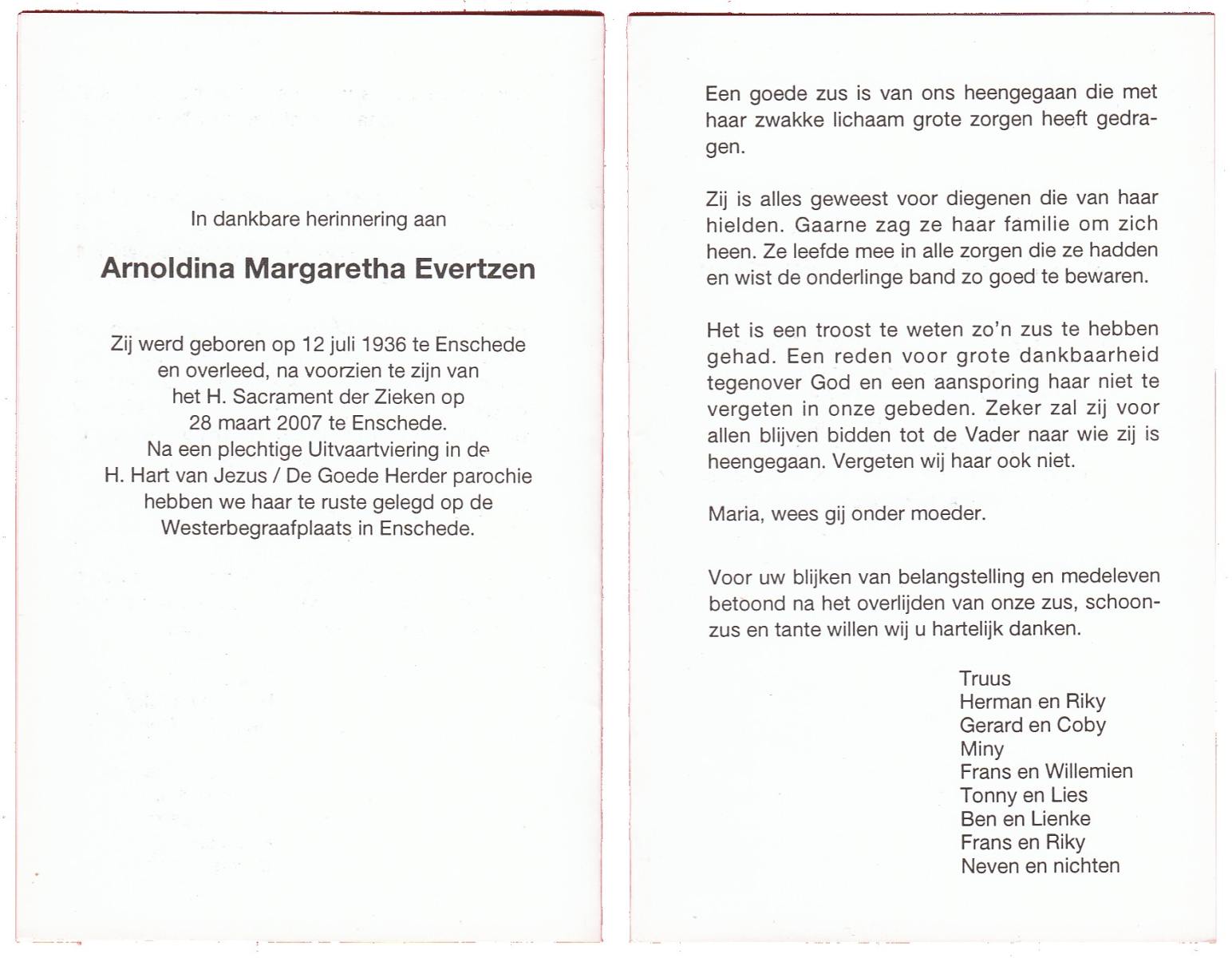 EVERTZEN, Arnoldina Margaretha, geboren op 12-7-1936 te Enschede, overleden op 28-3-2007 te Enschede op 70-jarige leeftijd, begraven te Enschede.