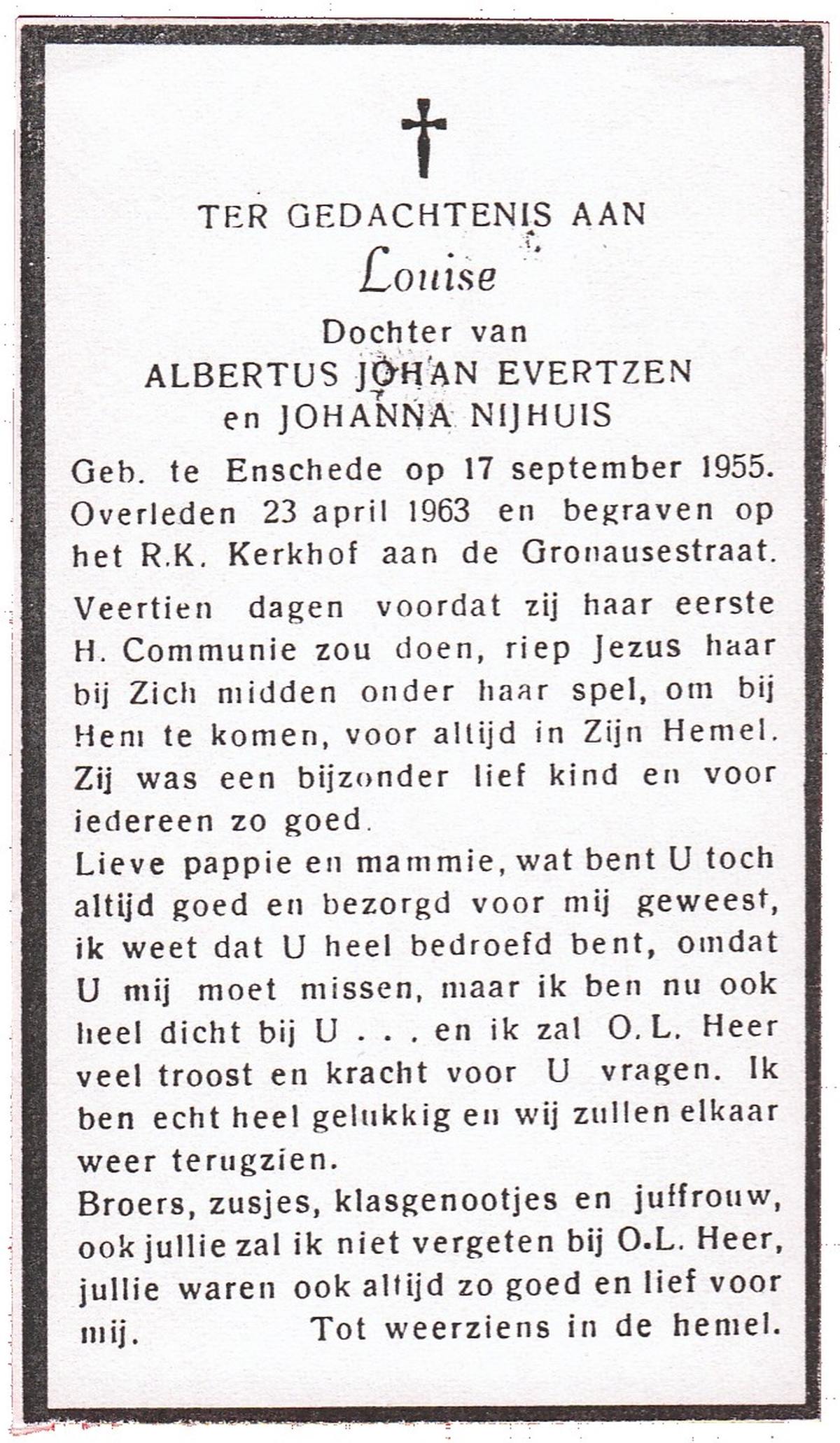 EVERTZEN, Louise, geboren op 17-9-1955 te Enschede, overleden op 23-4-1963 te Enschede op 7-jarige leeftijd, begraven te Enschede.