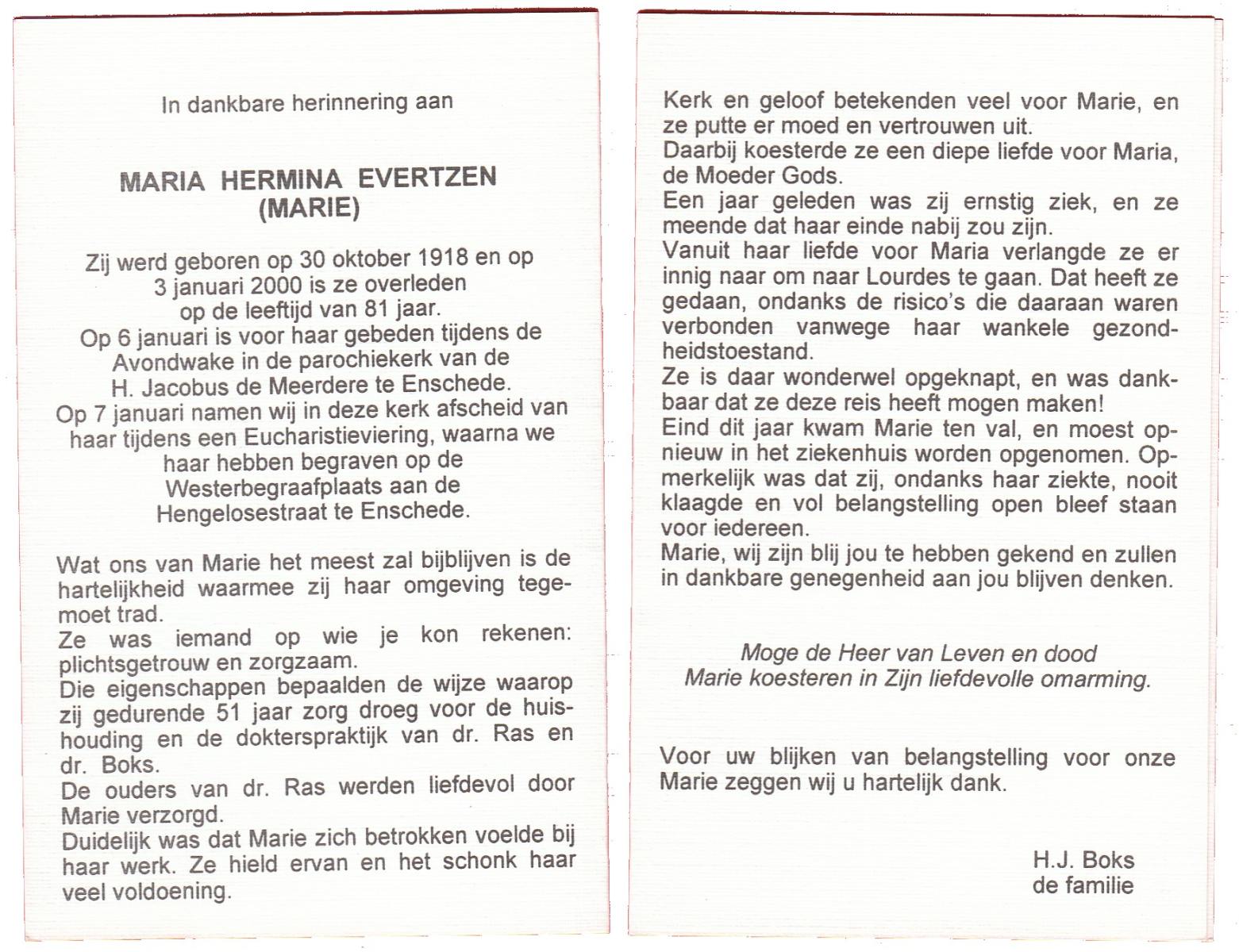 EVERTZEN, Maria Hermina (Marie), geboren op 30-10-1918, overleden op 3-1-2000 op 81-jarige leeftijd, begraven op 7-1-2000 te Enschede.