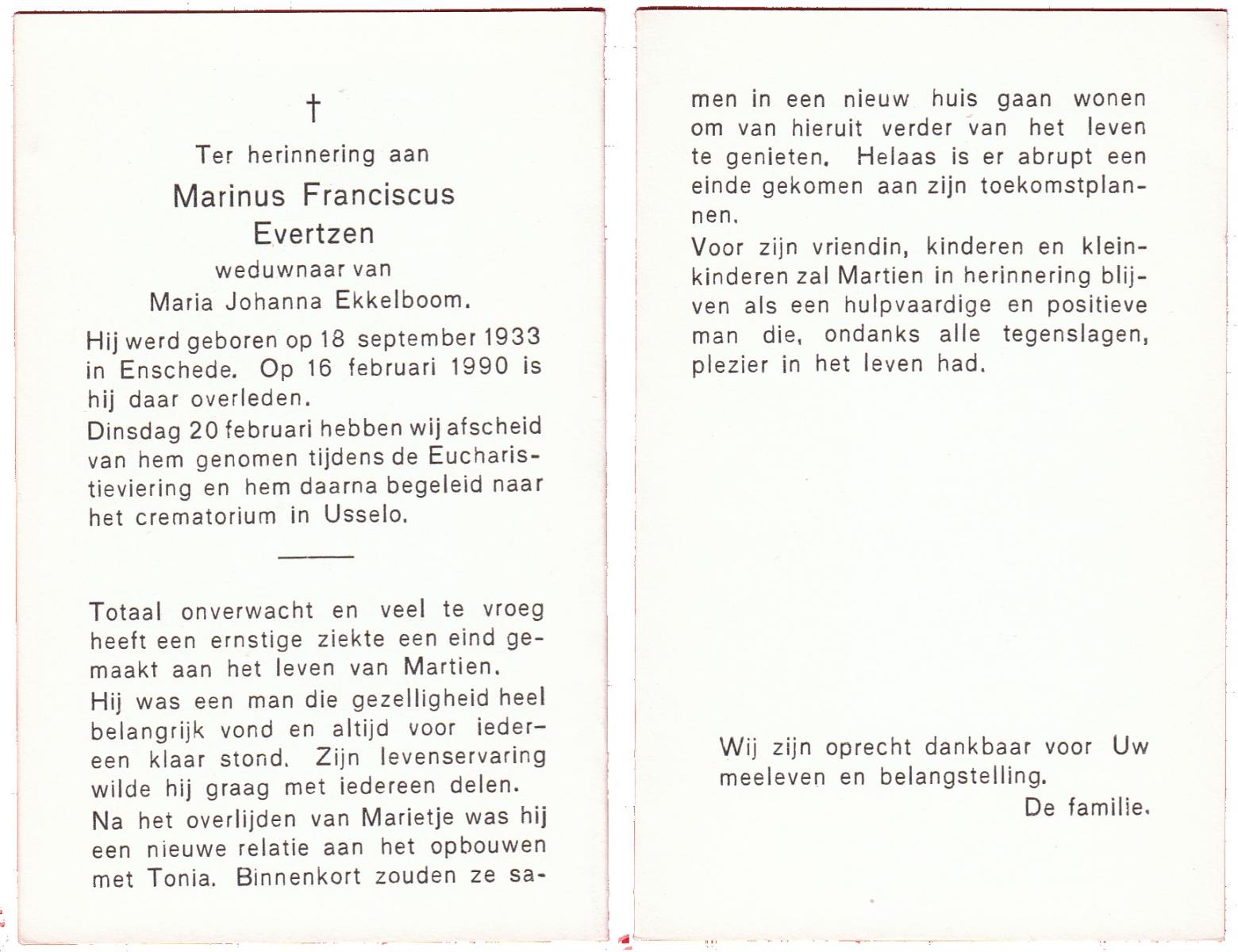 EVERTZEN, Marinus Franciscus, geboren op 18-9-1933 te Enschede, overleden op 16-2-1990 te Enschede op 56-jarige leeftijd, gecremeerd op 20-2-1990 te Usselo.