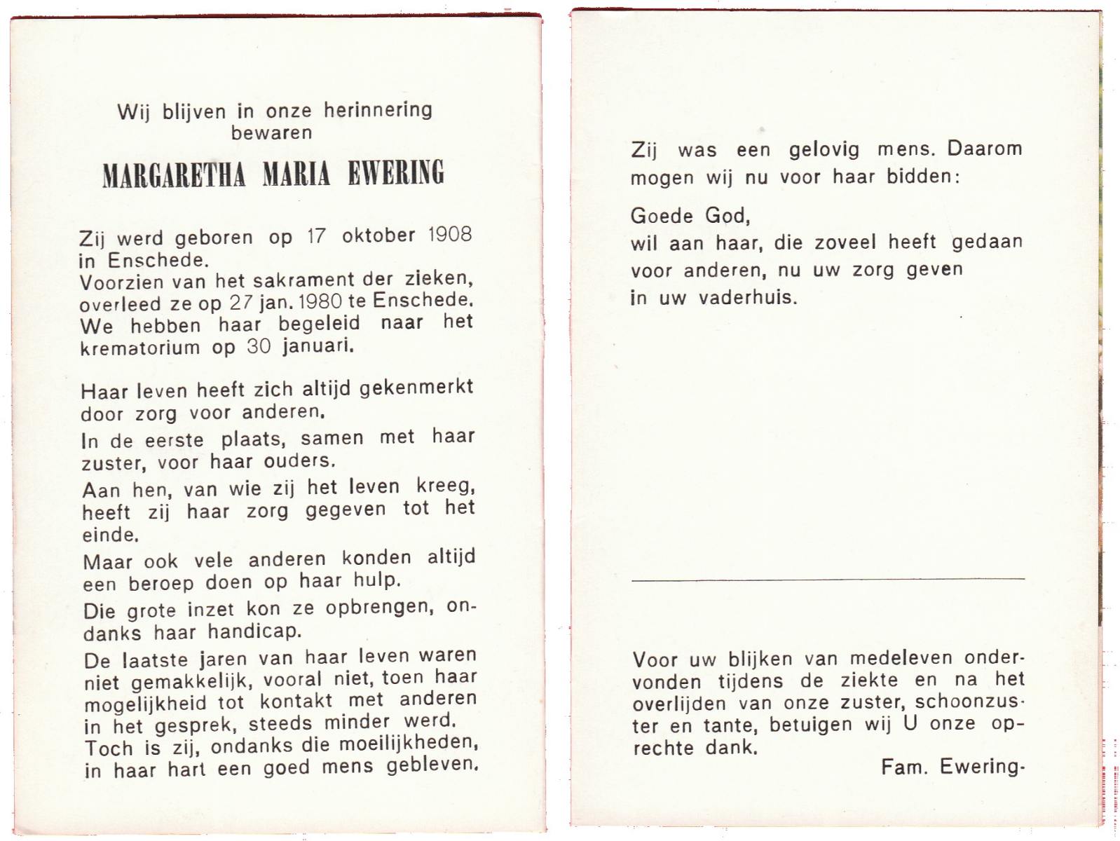 EWERING, Margaretha Maria, geboren op 17-10-1908 te Enschede, overleden op 27-1-1980 te Enschede op 71-jarige leeftijd, gecremeerd op 30-1-1980 te Usselo.