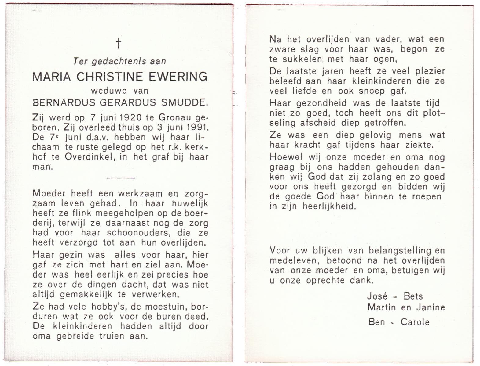 EWERING, Maria Christina, geboren op 7-6-1920 te Gronau (Dld.), overleden op 3-6-1991 op 70-jarige leeftijd, begraven op 7-6-1991 te Overdinkel.