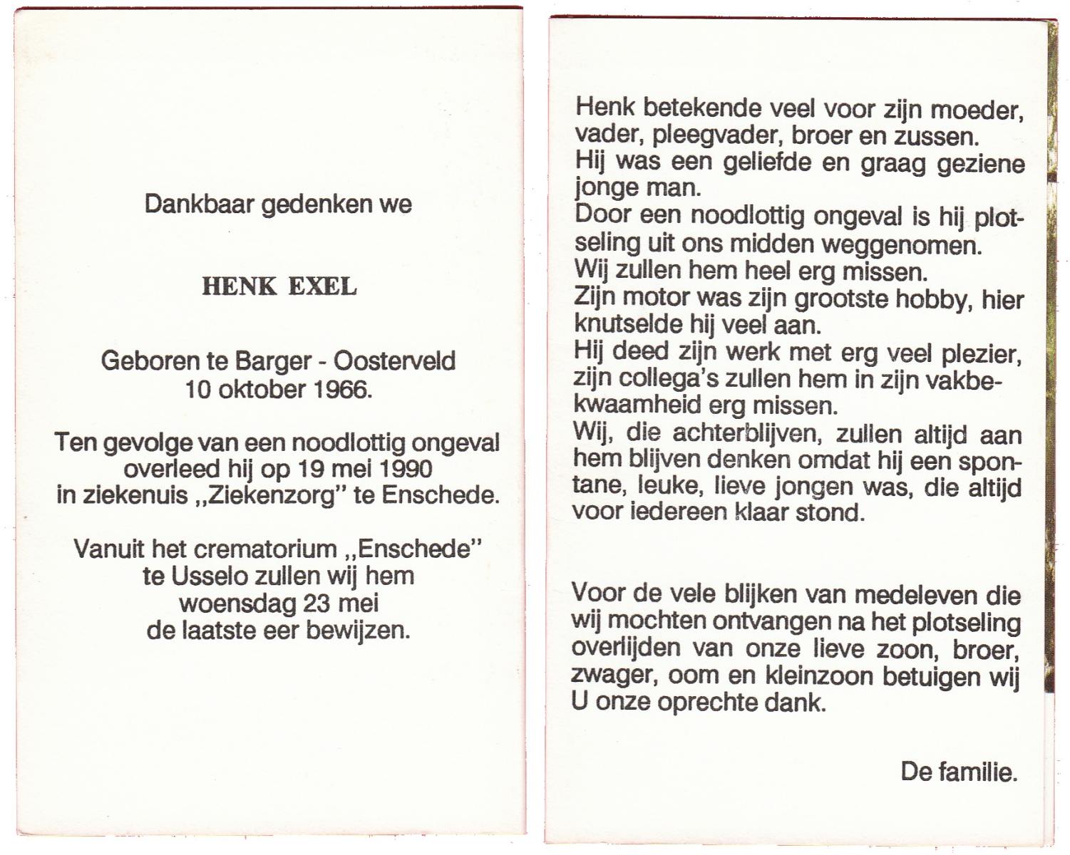 EXEL, Henk, geboren op 10-10-1966 te Barger-Oosterveld, overleden op 19-5-1990 te Enschede op 23-jarige leeftijd, gecremeerd op 23-5-1990 te Usselo.