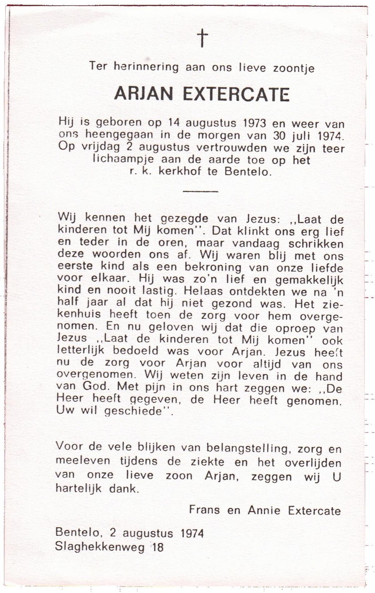 EXTERCATE, Arjan, geboren op 14-8-1973, overleden op 30-7-1974 op 0-jarige leeftijd, begraven op 2-8-1974 te Bentelo.