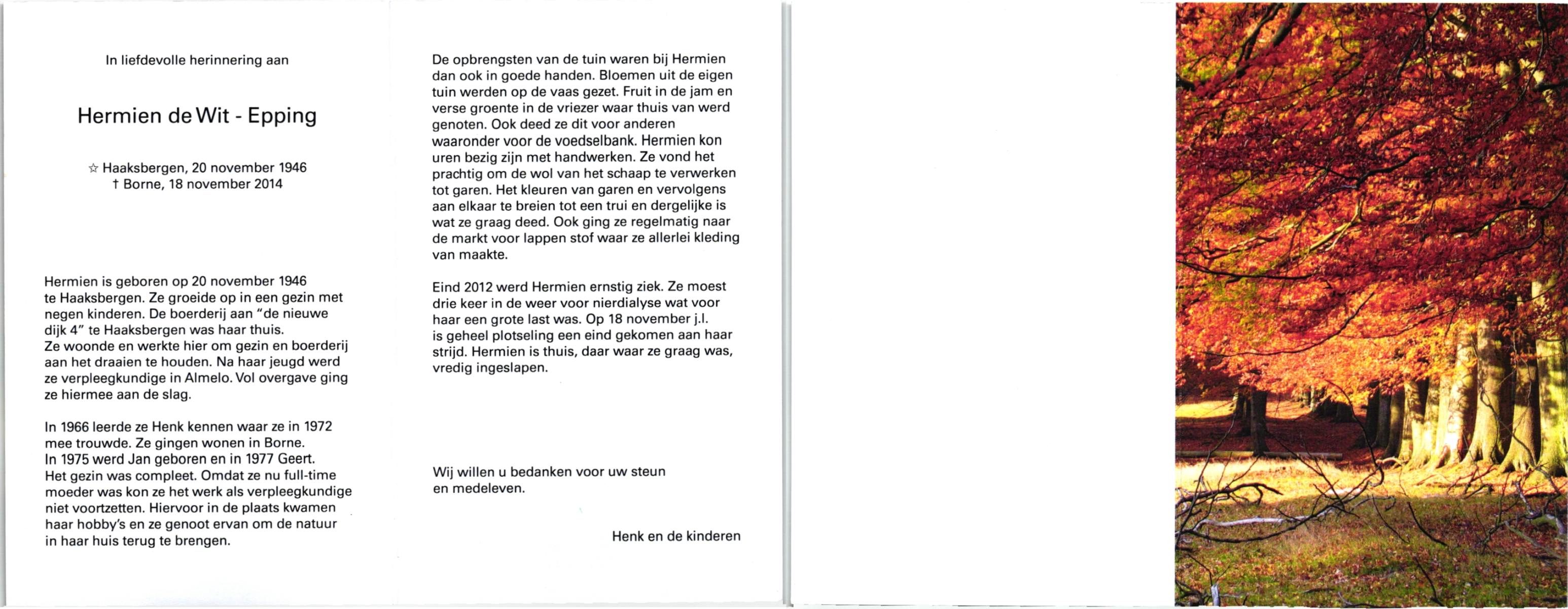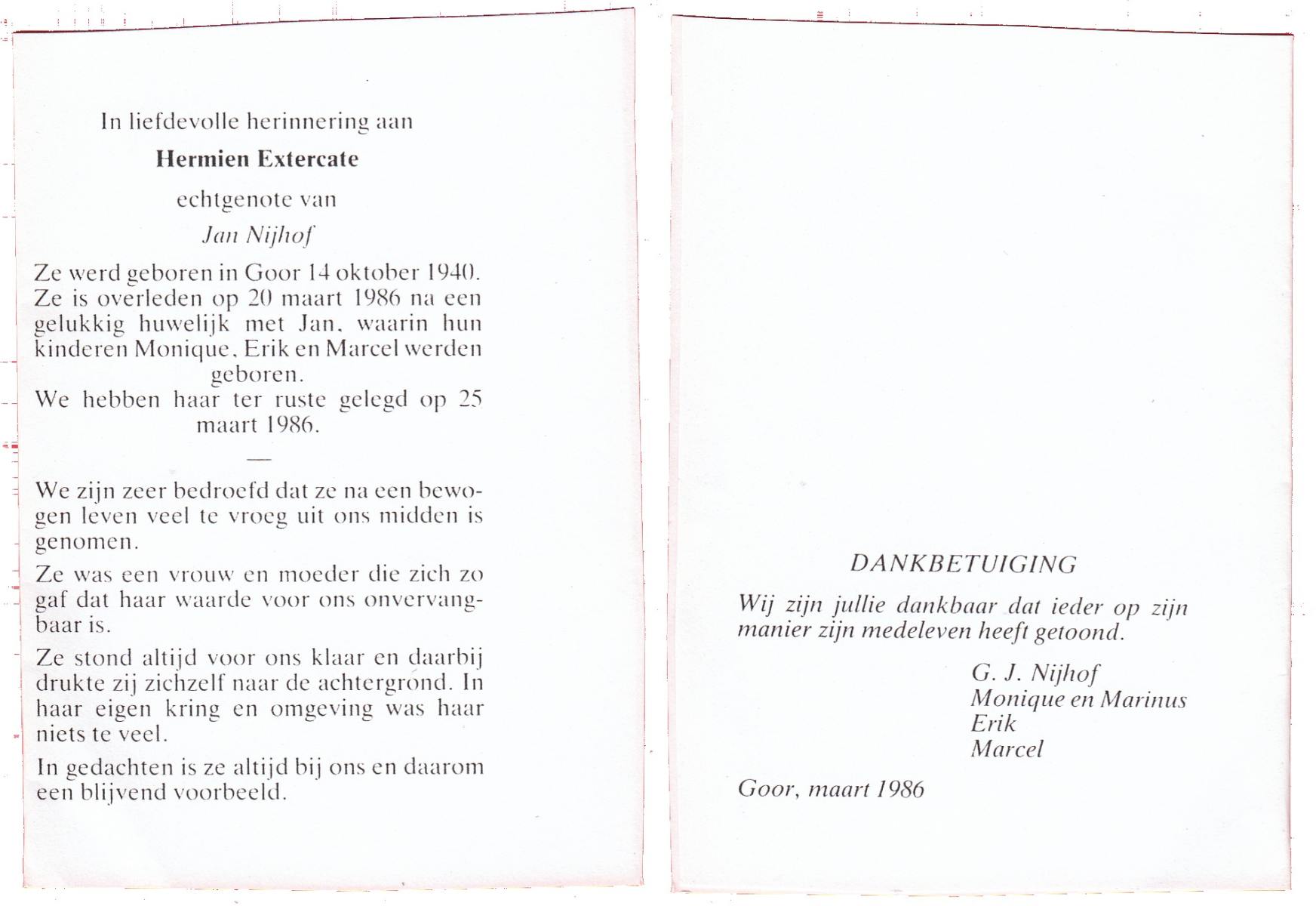 EXTERCATE, Hermien, geboren op 14-10-1940 te Goor, overleden op 20-3-1986 op 45-jarige leeftijd, begraven op 25-3-1986.