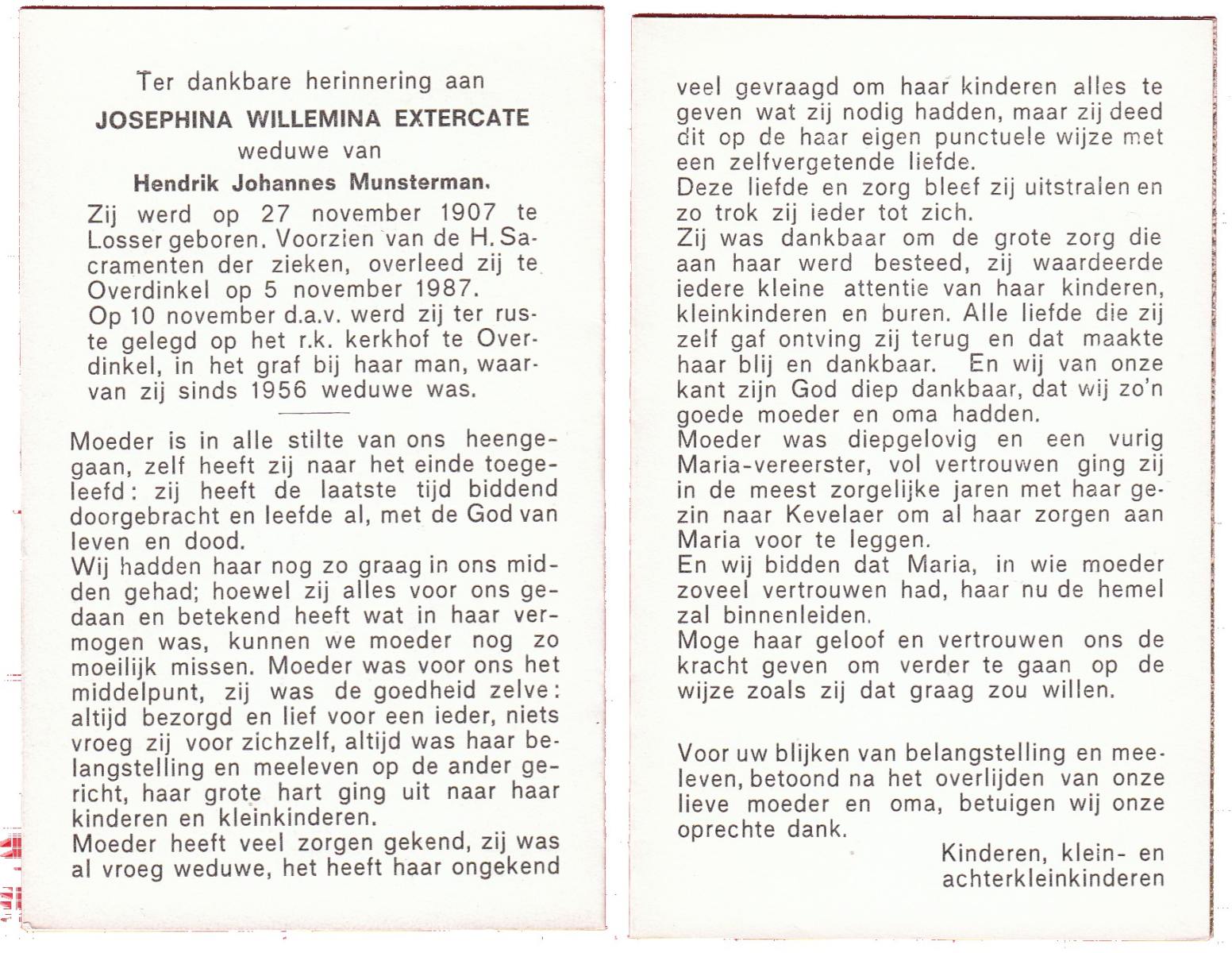 EXTERCATE, Josephina Willemina, geboren op 27-11-1907 te Losser, overleden op 5-11-1987 te Overdinkel op 79-jarige leeftijd, begraven op 10-11-1987 te Overdinkel.