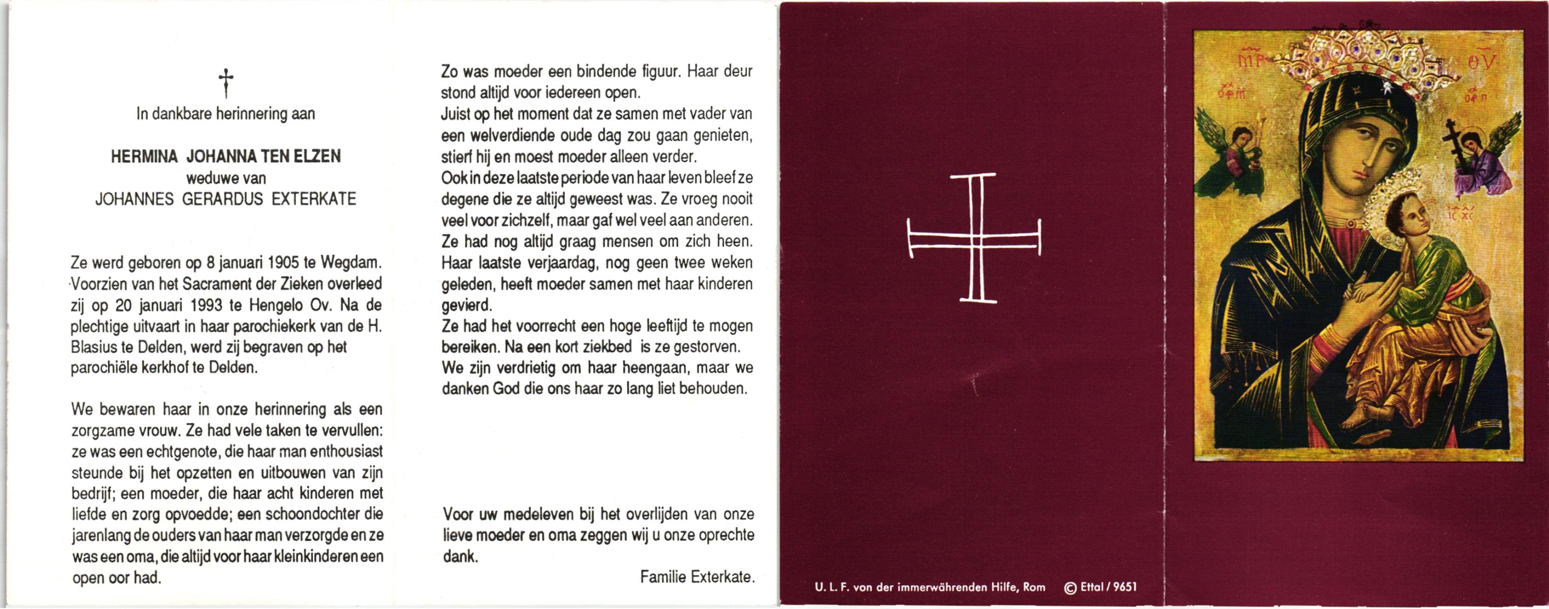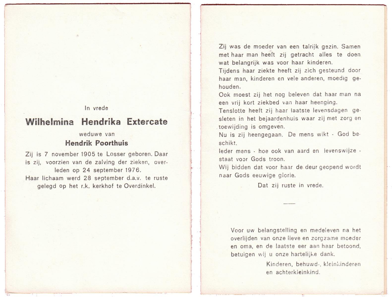 EXTERCATE, Wilhelmina Hendrika, geboren op 7-11-1905 te Losser, overleden op 24-9-1976 te Losser op 70-jarige leeftijd, begraven op 28-9-1976 te Overdinkel.