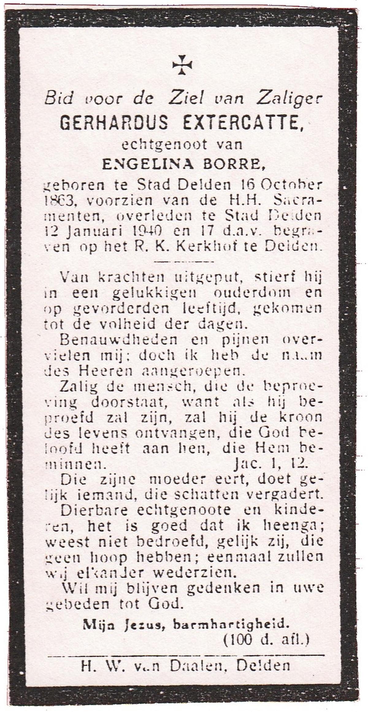 EXTERCATTE, Gerhardus, geboren op 16-10-1863 te Delden, Stad, overleden op 12-1-1940 te Delden, Stad op 73-jarige leeftijd, begraven op 17-1-1940 te Delden.