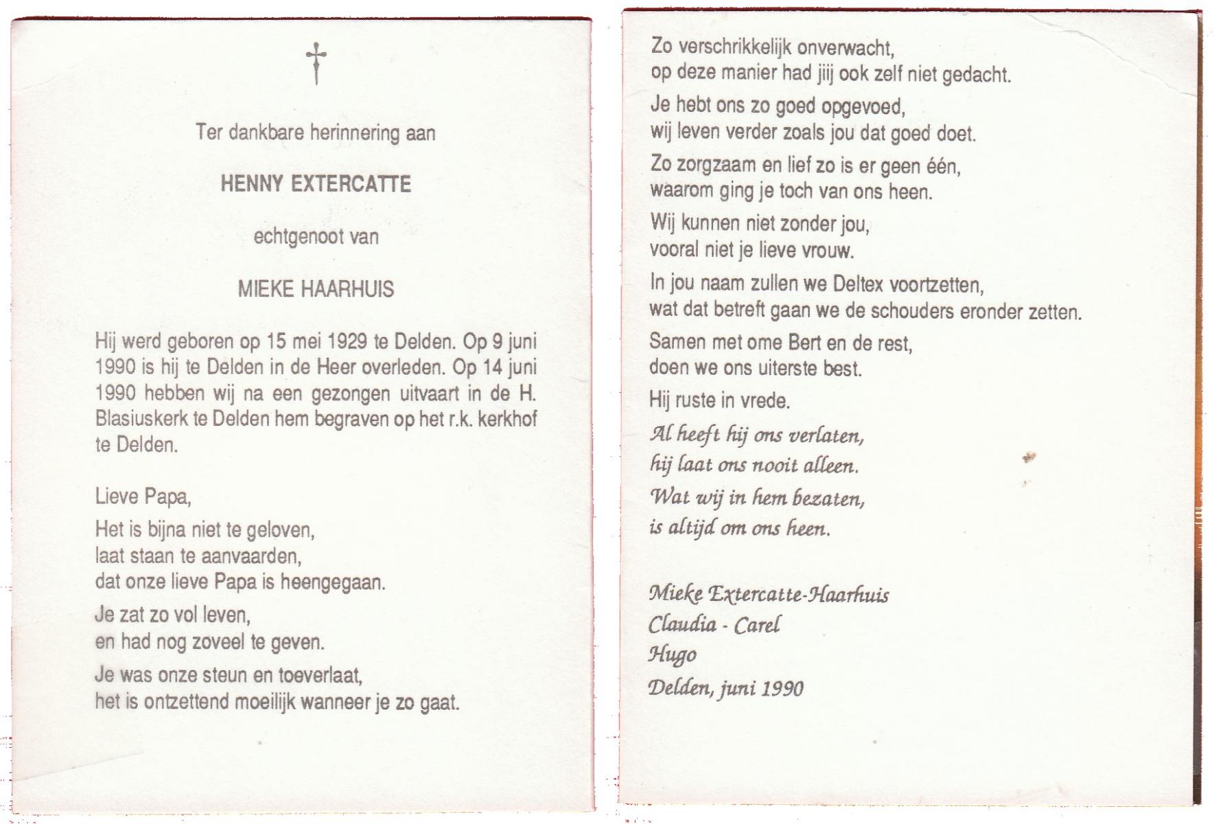 EXTERCATTE, Henny, geboren op 15-5-1929 te Delden, overleden op 9-6-1990 te Delden op 61-jarige leeftijd, begraven op 14-6-1990 te Delden.