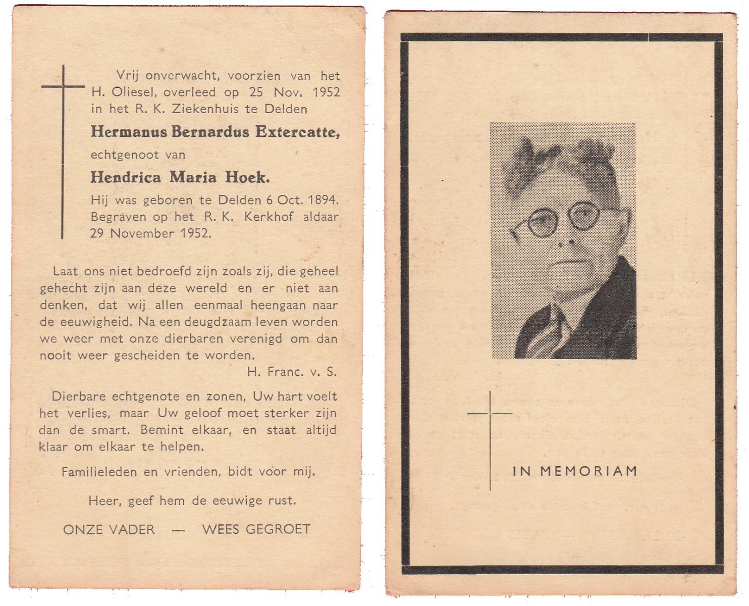 EXTERCATTE, Hermanus Bernardus, geboren op 06-10-1894 te Delden op 58-jarige leeftijd, begraven op 29-11-1952 te Delden.