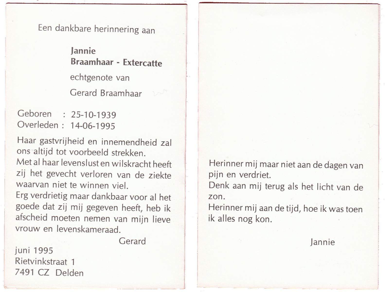 EXTERCATTE, Jannie, geboren op 25-10-1939, overleden op 14-6-1995 op 55-jarige leeftijd.