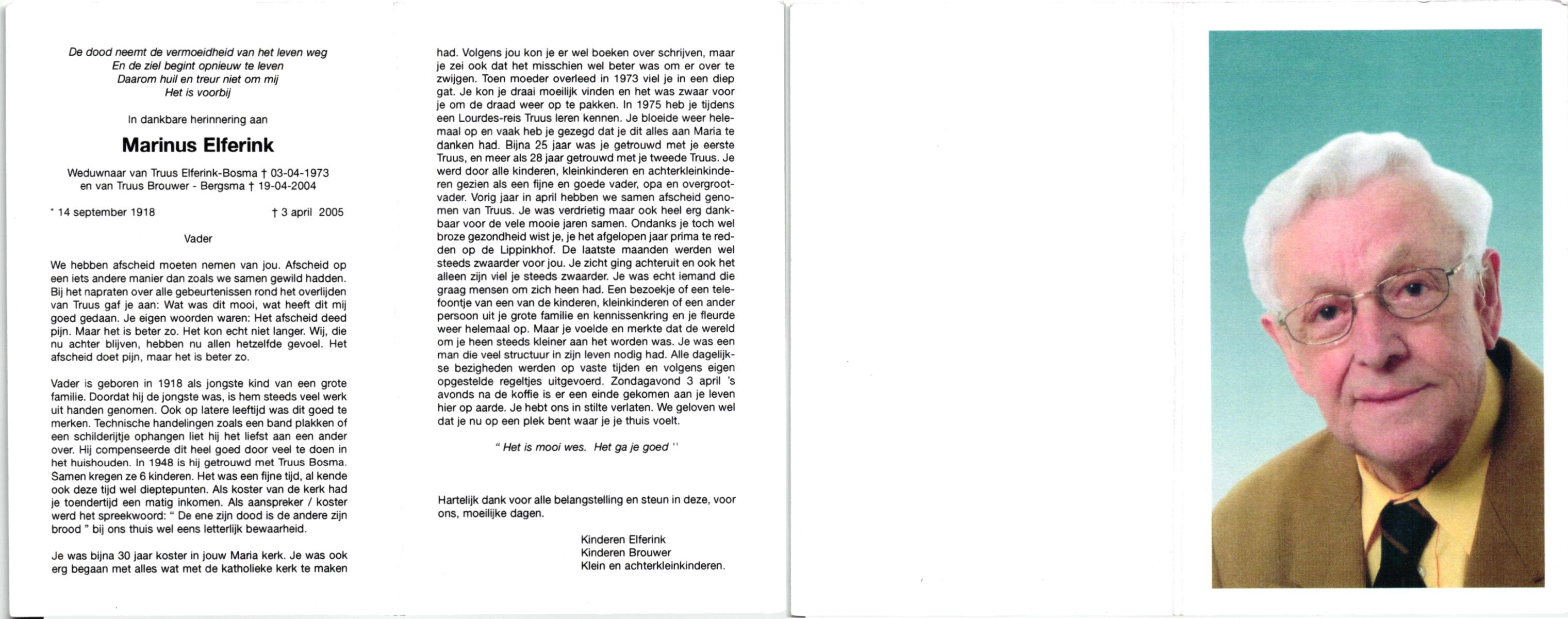 ELFERINK, , Marinus, geboren op 14-9-1918, overleden op 3-4-2005 op 86-jarige leeftijd.