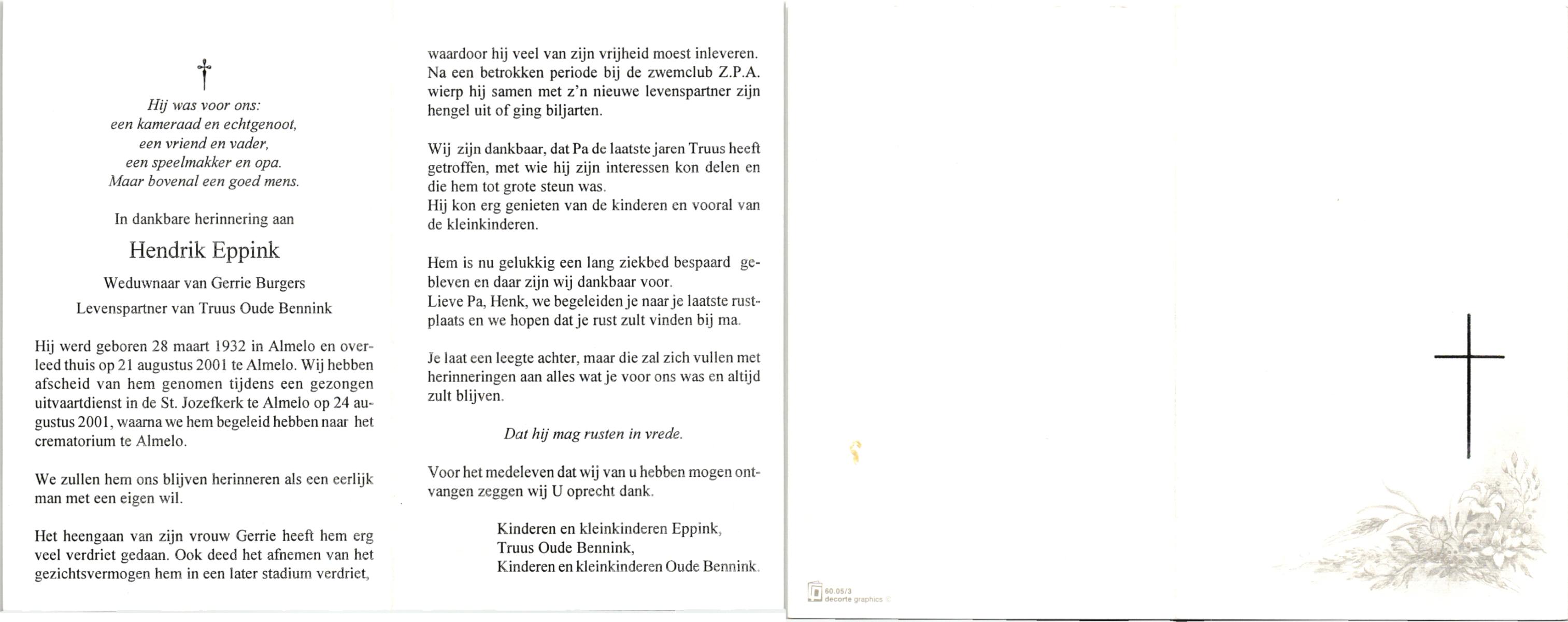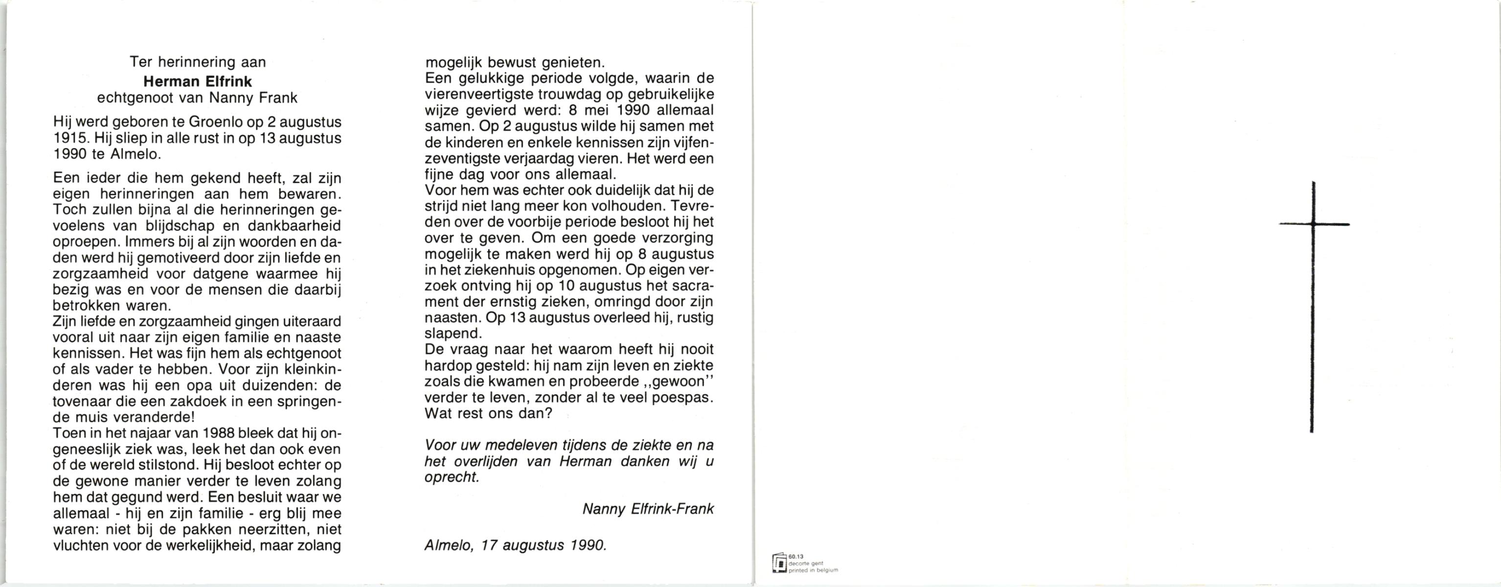 ELFRINK, , Herman, geboren op 2-8-1915 te Groenlo, overleden op 13-8-1990 te Almelo op 75-jarige leeftijd.