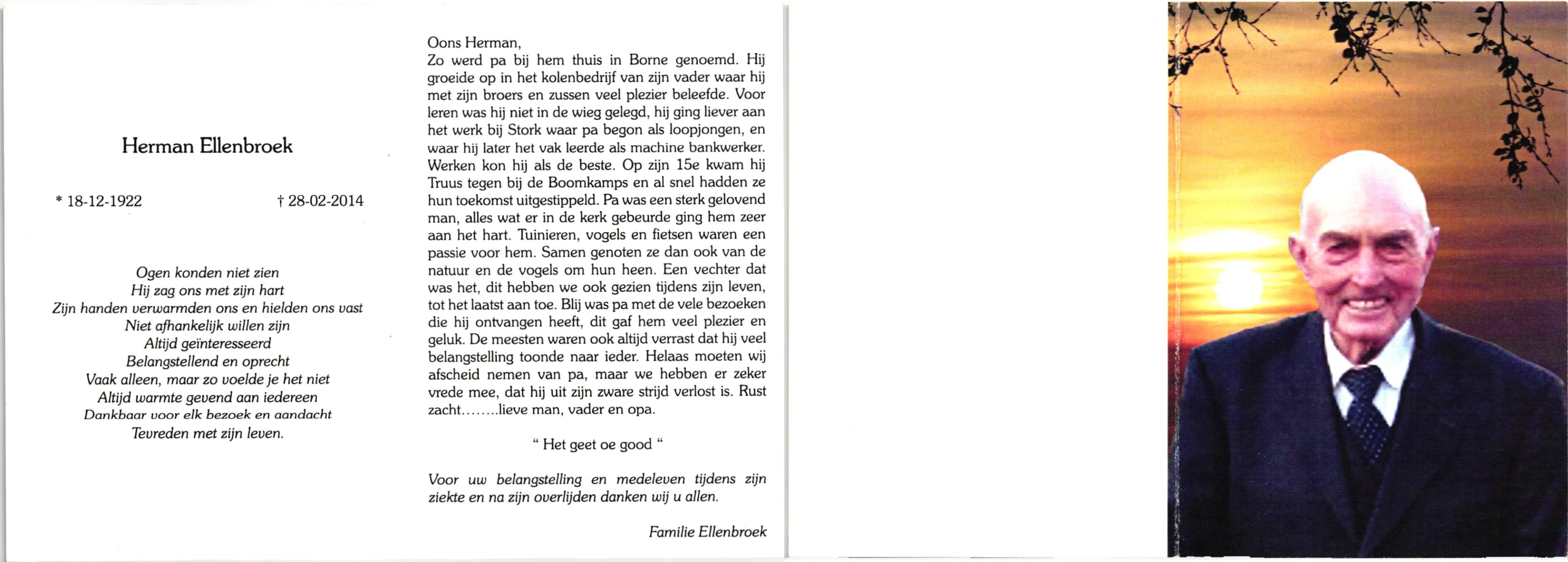 ELLENBROEK, , Herman, geboren op 18-12-1922, overleden op 28-2-2014 op 91-jarige leeftijd.