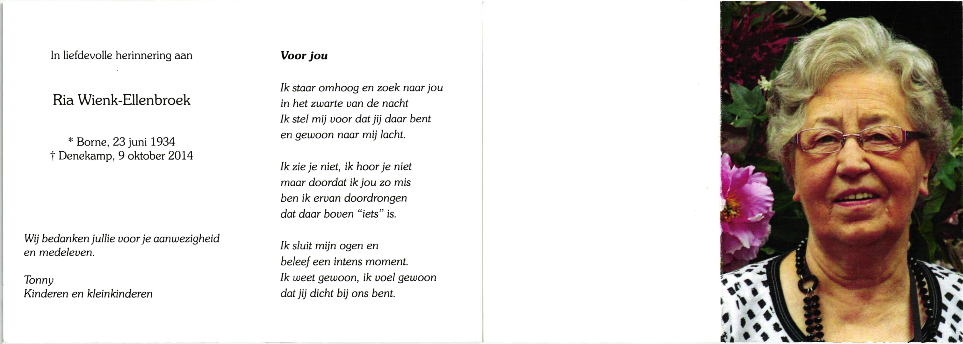 ELLENBROEK, , Ria, geboren op 23-6-1934 te Borne, overleden op 9-10-2014 te Denekamp op 80-jarige leeftijd.