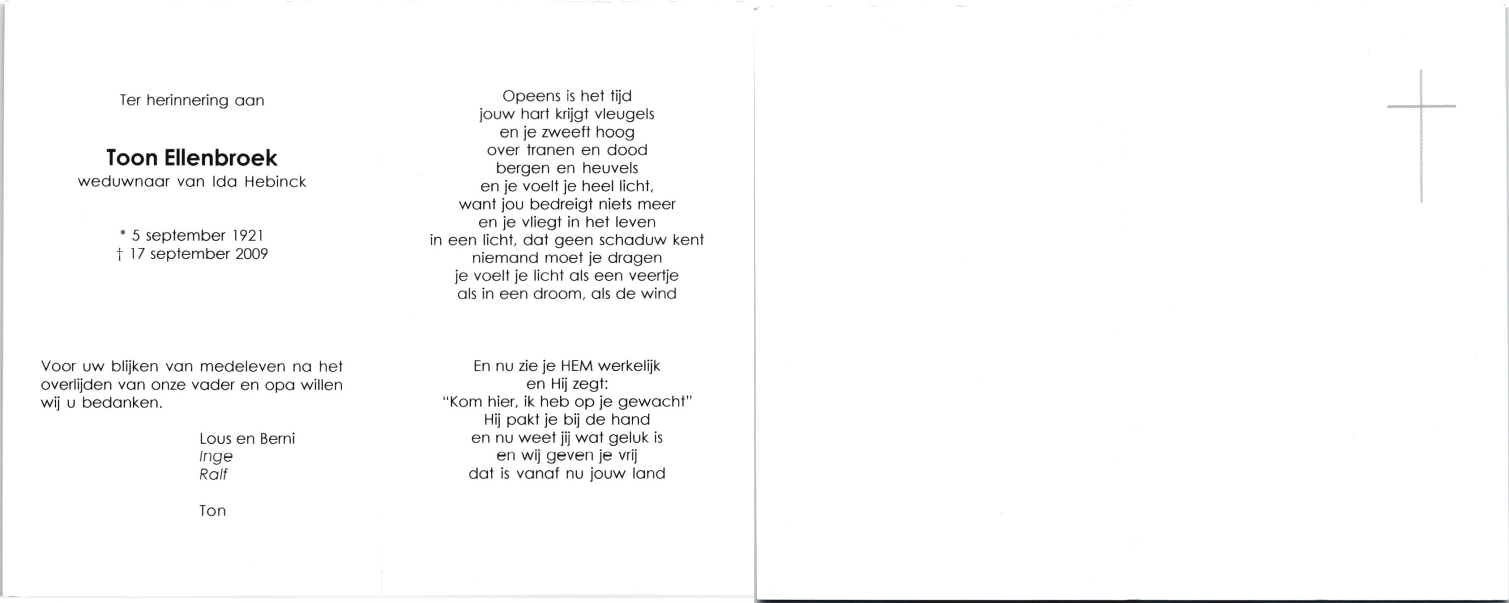 ELLENBROEK, , Toon, geboren op 5-9-1921, overleden op 17-9-2009 op 88-jarige leeftijd.
