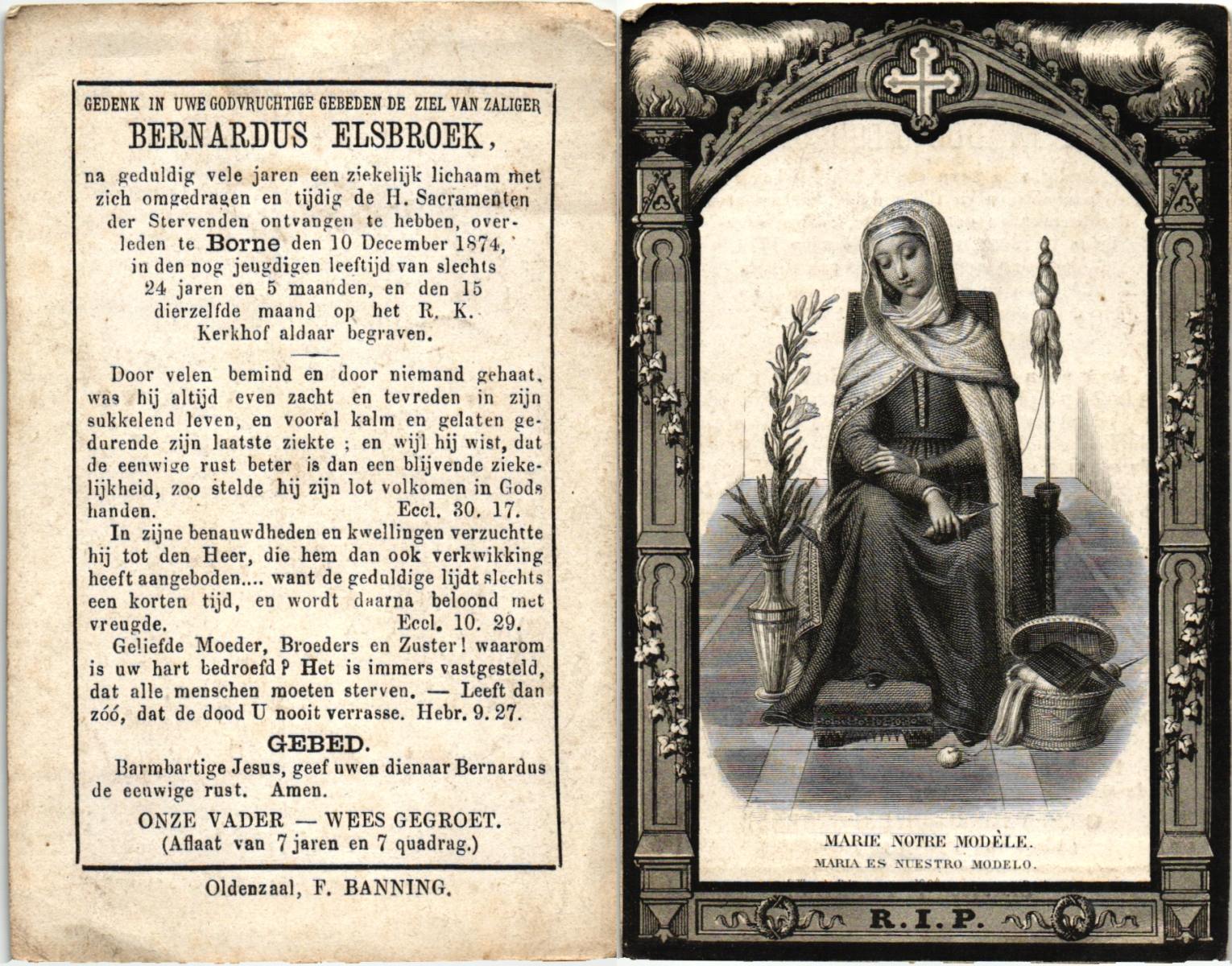 ELSBROEK, , Bernardus, overleden op 10-12-1874 te Borne op 24-jarige leeftijd, begraven op 15-12-1874 te Borne.