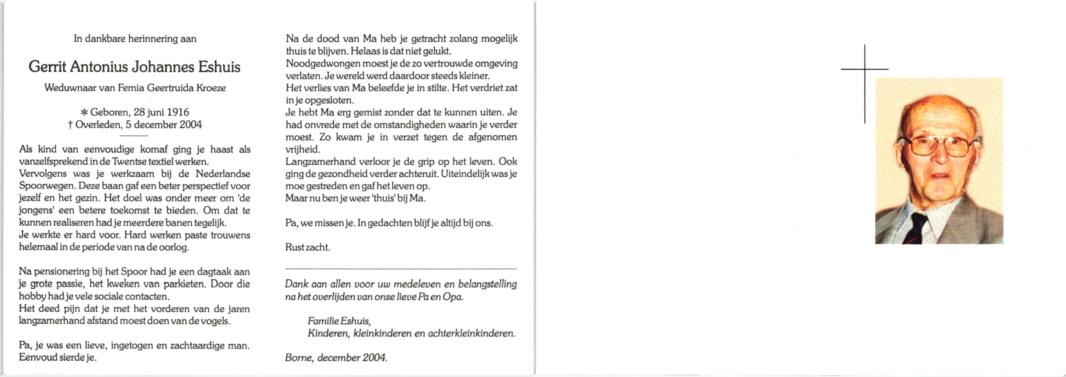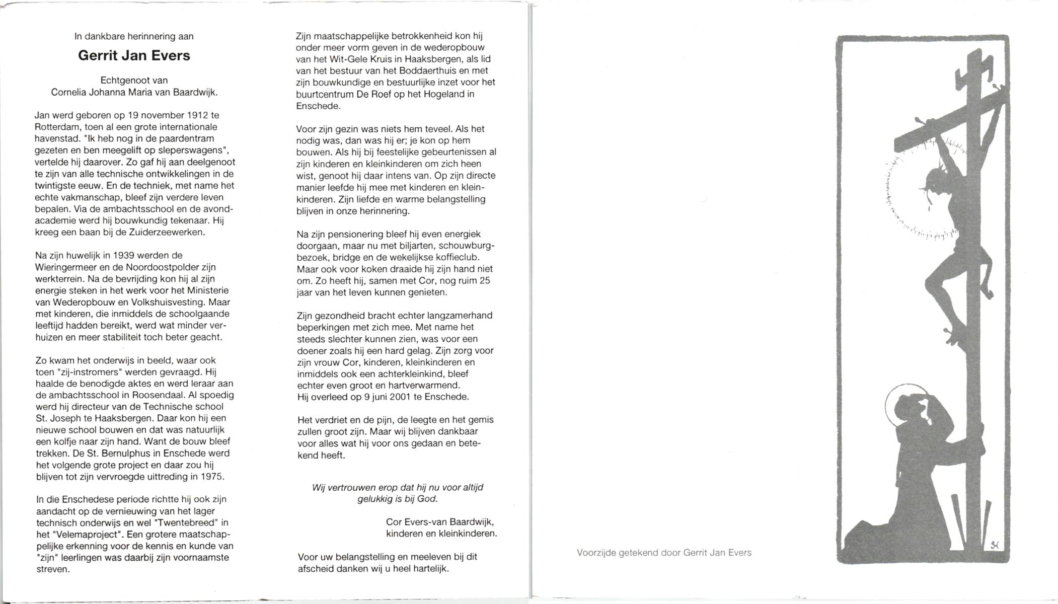 EVERS, , Gerrit Jan, geboren op 19-11-1912 te Rotterdam, overleden op 9-6-2001 te Enschede op 88-jarige leeftijd.
