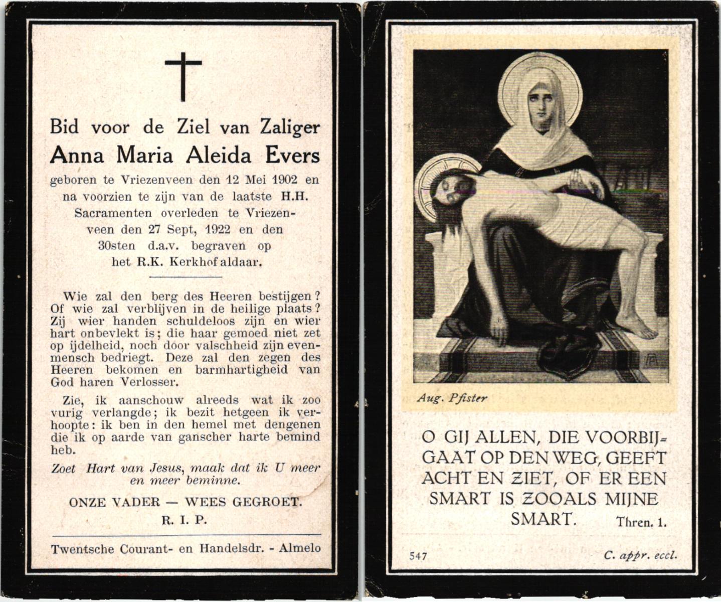 EVERS, , Anna Maria Aleida, geboren op 12-5-1902 te Vriezenveen, overleden op 27-9-1922 te Vriezenveen op 20-jarige leeftijd, begraven op 27-9-1922 te Vriezenveen.