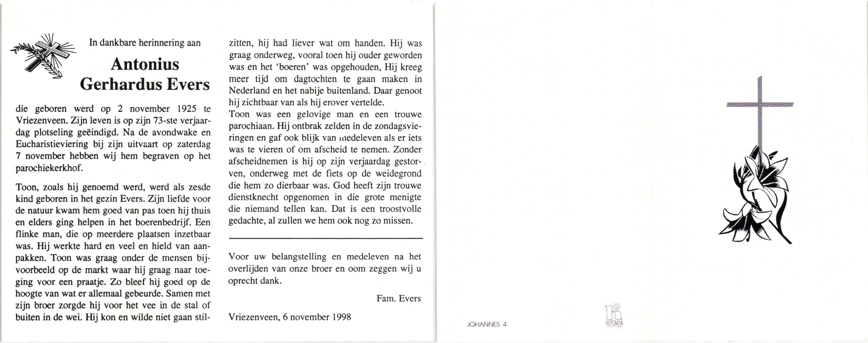 EVERS, , Antonius Gerhardus, geboren op 2-11-1925 te Vriezenveen, overleden op 2-11-1998 te Vriezenveen op 73-jarige leeftijd, begraven op 7-11-1998 te Vriezenveen.