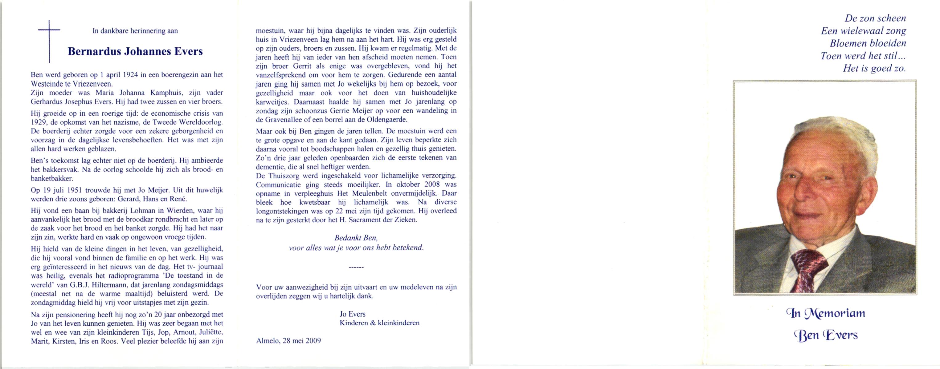 EVERS, , Bernardus Johannes, geboren op 1-4-1924 te Vriezenveen, overleden op 22-5-2009 te Almelo op 85-jarige leeftijd.