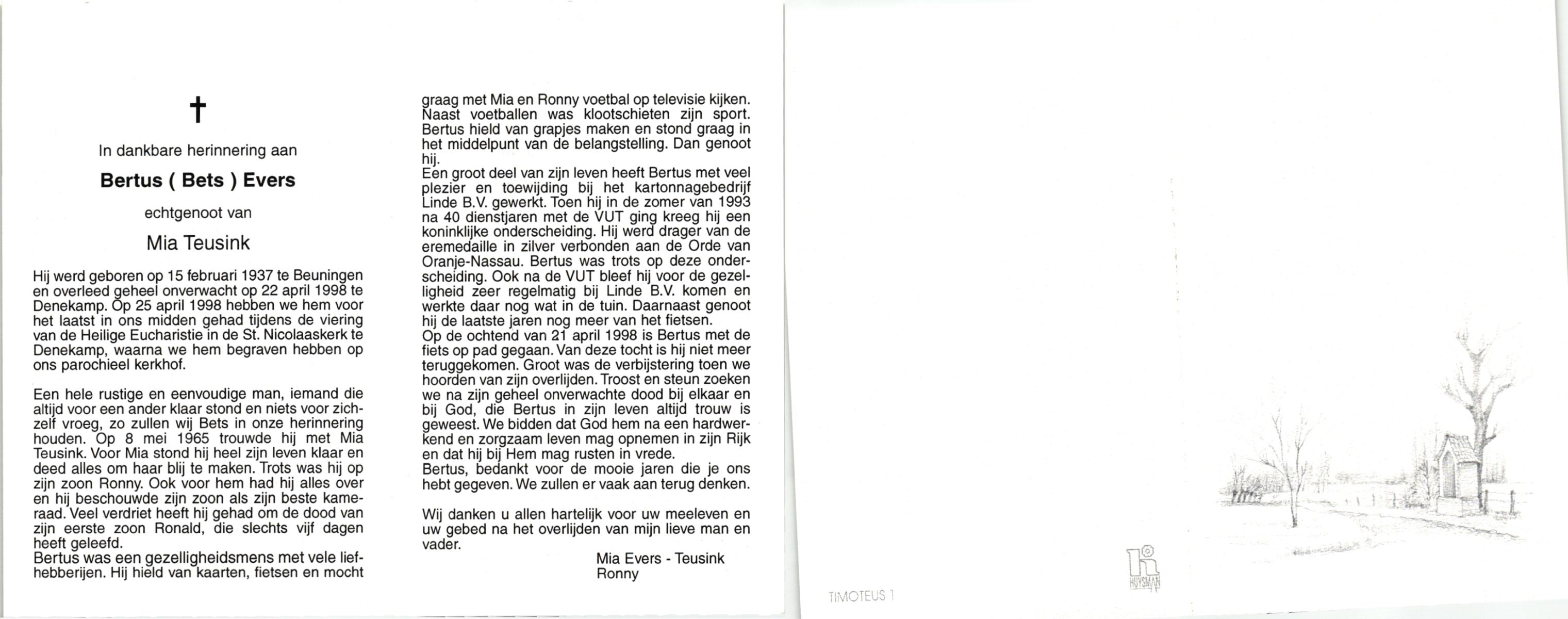 EVERS, , Bertus (Bets), geboren op 15-2-1937 te Beuningen, overleden op 22-4-1998 te Denekamp op 61-jarige leeftijd, begraven te Denekamp.