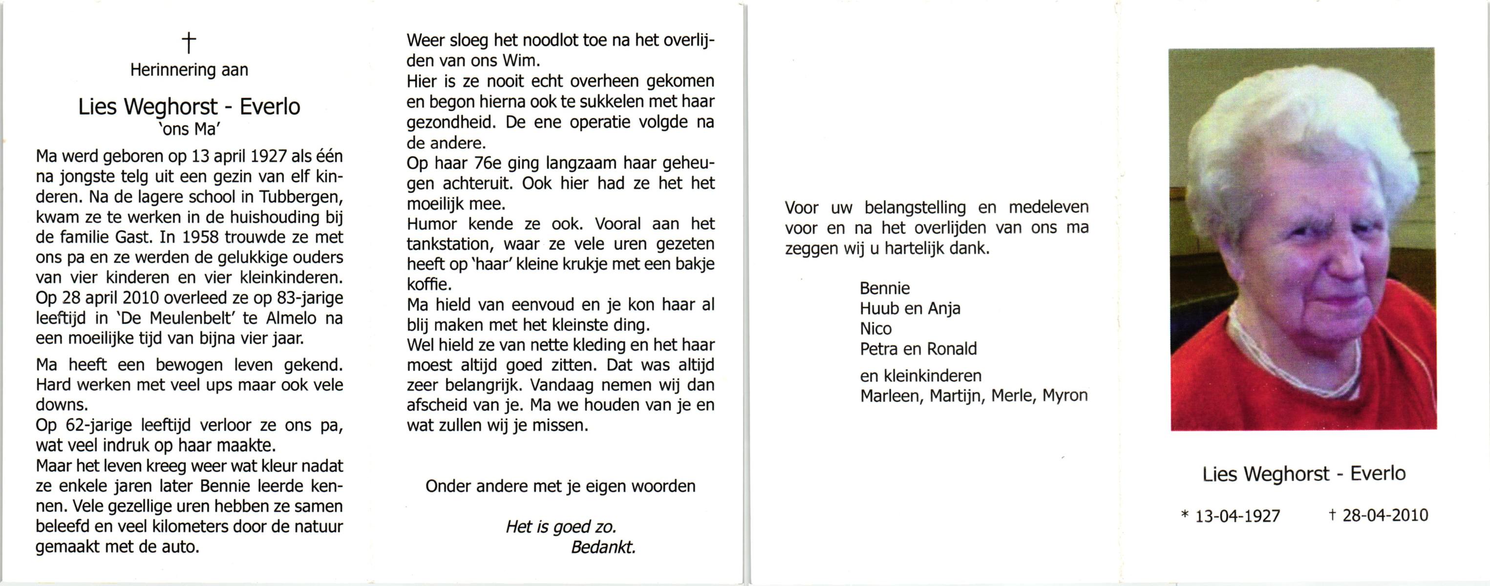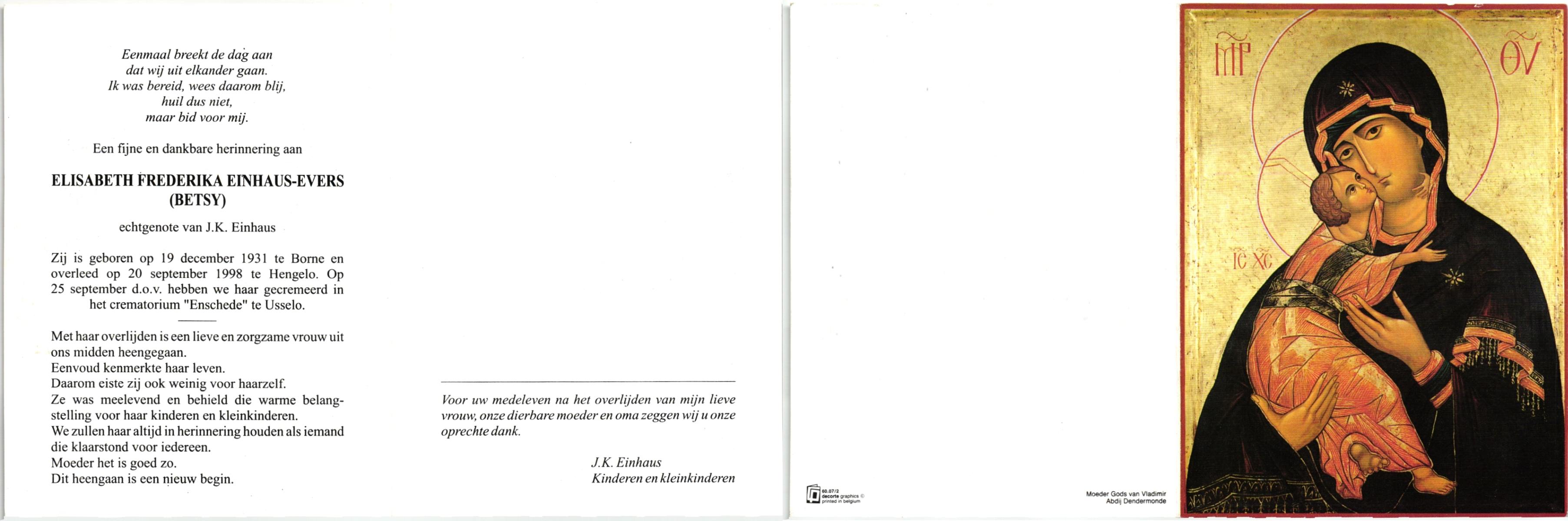 EVERS, , Elisabeth Frederika (Betsy), geboren op 19-12-1931 te Borne, overleden op 20-9-1998 te Hengelo (O) op 66-jarige leeftijd, gecremeerd op 23-9-1998 te Usselo.