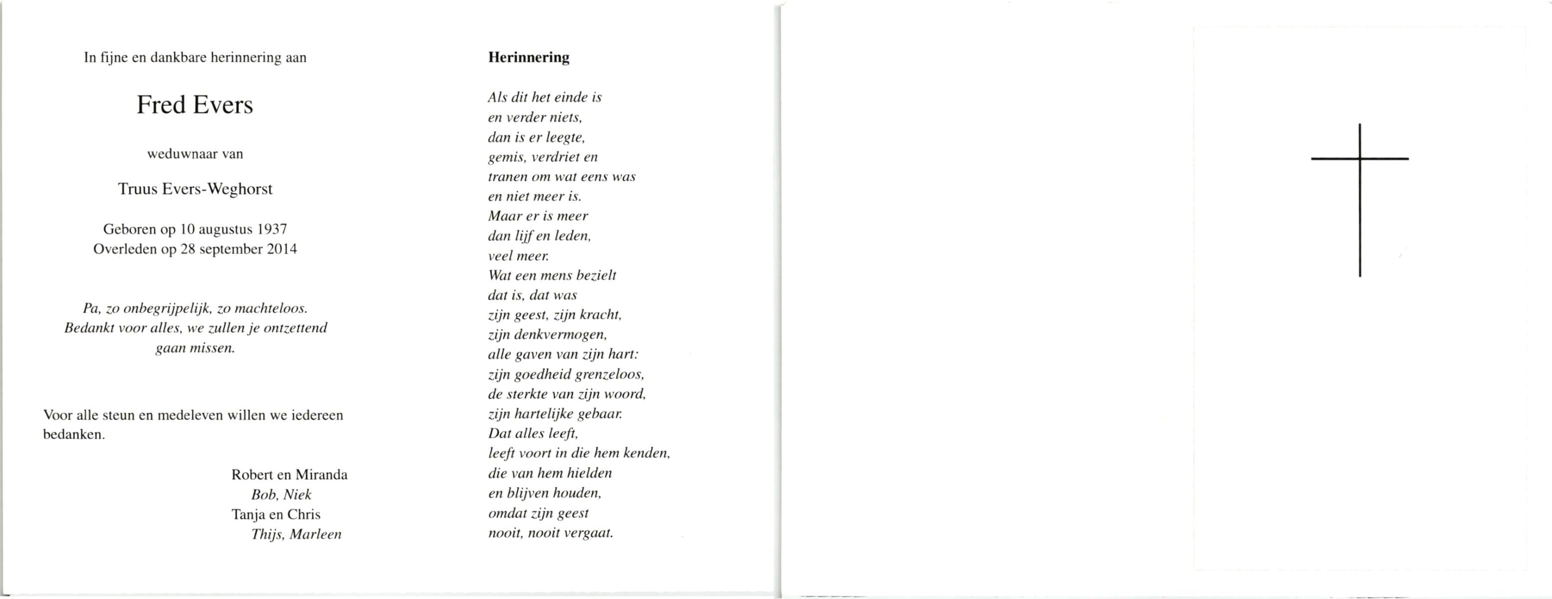EVERS, , Fred, geboren op 10-8-1937, overleden op 28-9-2014 op 77-jarige leeftijd.