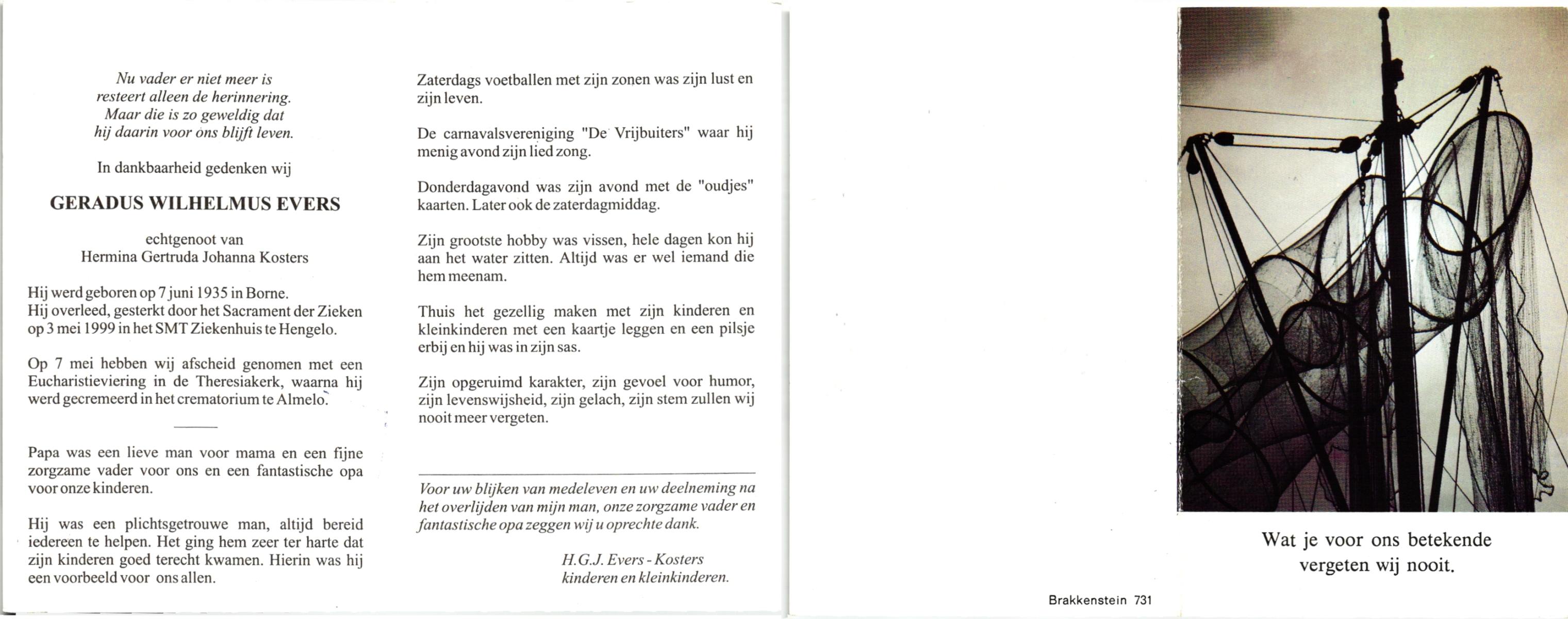 EVERS, , Geradus Wilhelmus, geboren op 7-6-1935 te Borne, overleden op 3-5-1999 te Hengelo (O) op 63-jarige leeftijd, gecremeerd op 7-5-1999 te Almelo.