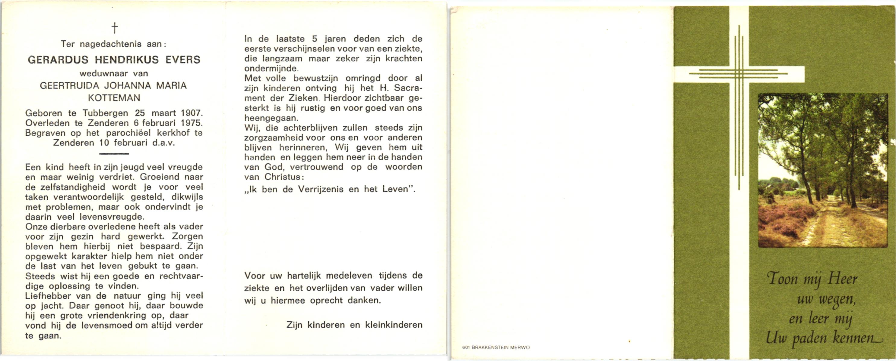 EVERS, , Gerardus Hendrikus, geboren op 25-3-1907 te Tubbergen, overleden op 6-2-1975 te Zenderen op 67-jarige leeftijd, begraven op 10-2-1975 te Zenderen.