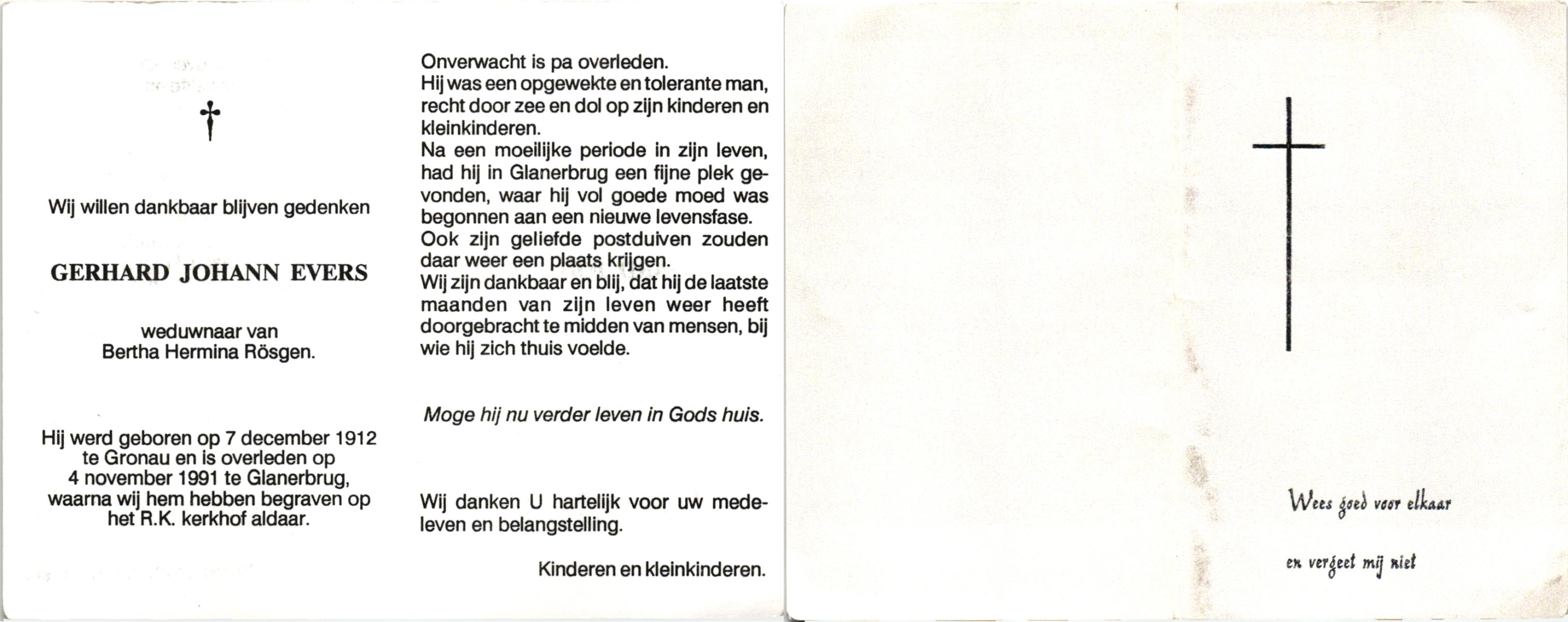 EVERS, , Gerhard Johann, geboren op 7-12-1912 te Gronau, Dld, overleden op 4-11-1991 te Glanerbrug op 78-jarige leeftijd, begraven te Glanerbrug.