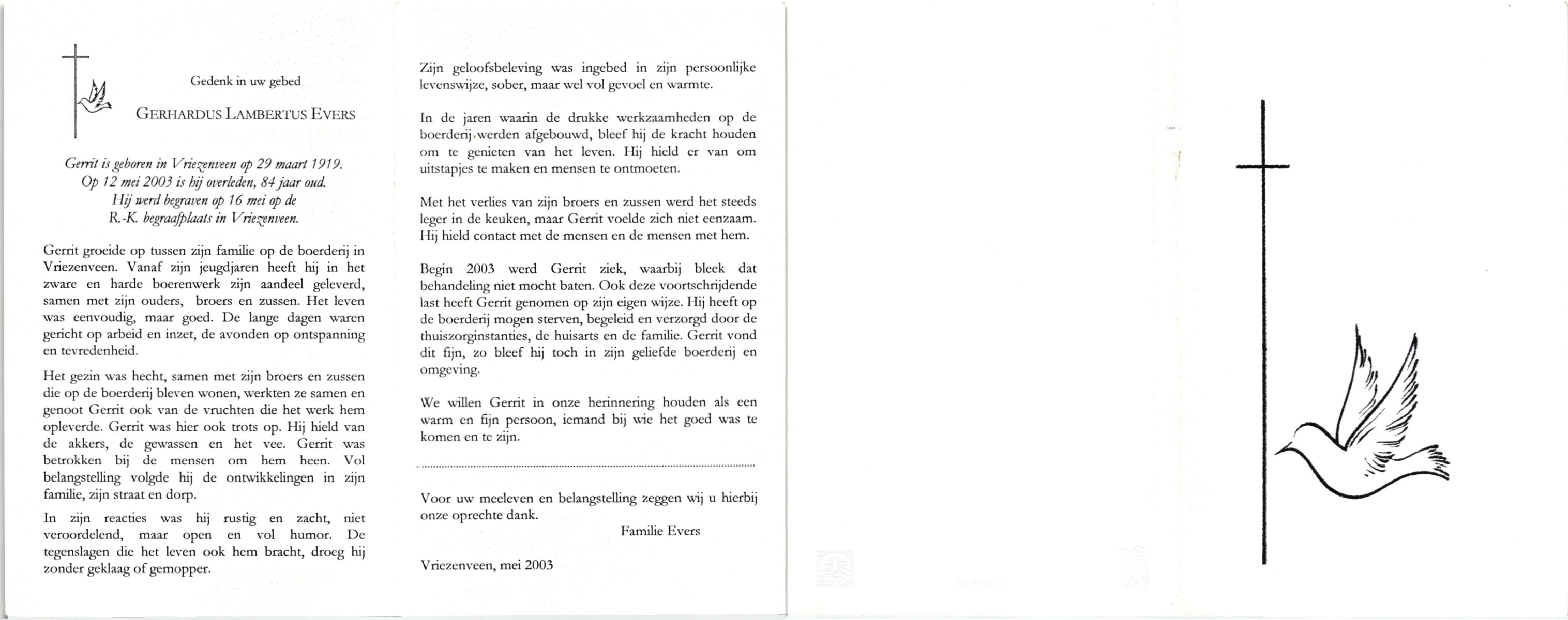EVERS, , Gerhardus Lambertus, geboren op 29-3-1919 te Vriezenveen, overleden op 12-5-2003 op 84-jarige leeftijd, begraven op 16-5-2003 te Vriezenveen.