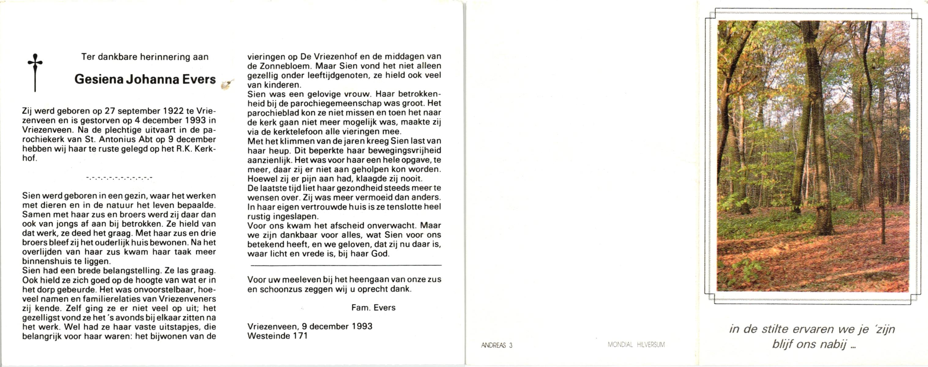 EVERS, , Gesiena Johanna, geboren op 27-9-1922 te Vriezenveen, overleden op 4-12-1993 te Vriezenveen op 71-jarige leeftijd, begraven op 9-12-1993 te Vriezenveen.