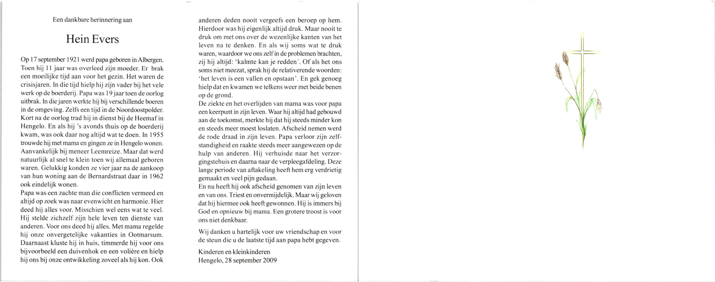 EVERS, , Hein, geboren op 17-9-1921 te Albergen, overleden op 00-09-2009.