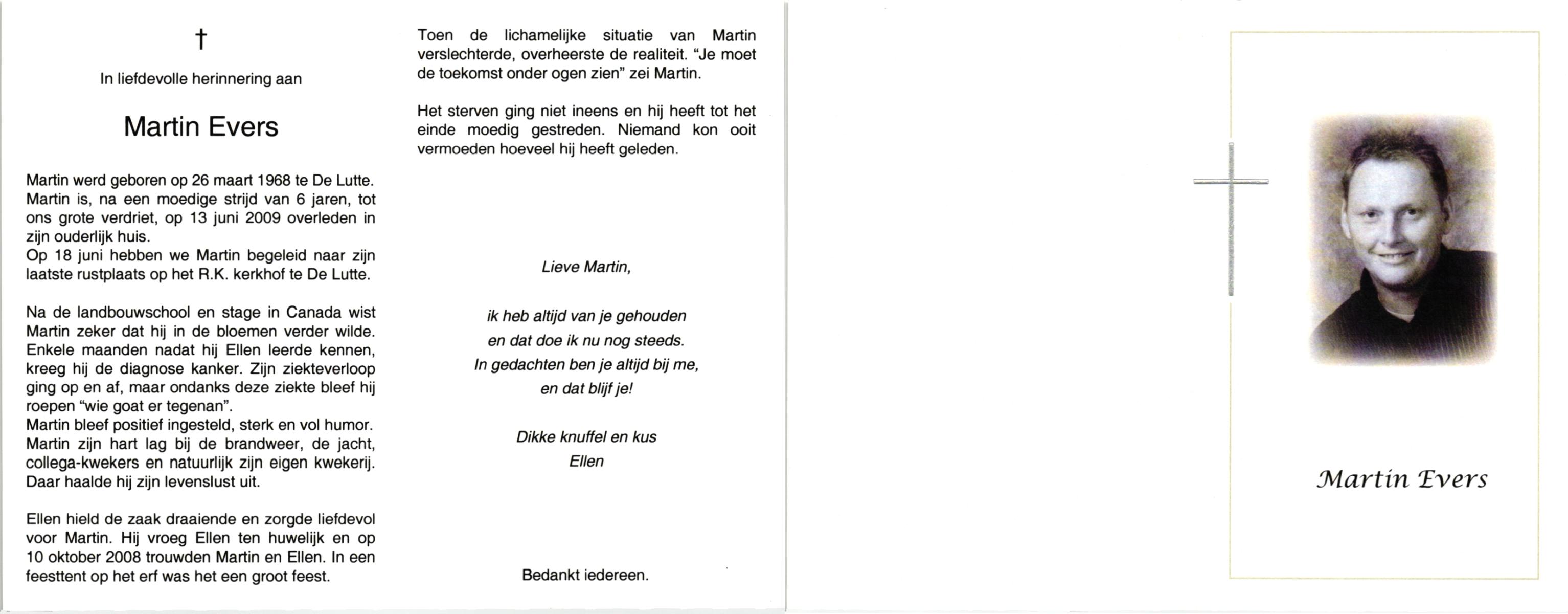 EVERS, , Martin, geboren op 26-3-1968 te De Lutte, overleden op 13-6-2009 te De Lutte op 41-jarige leeftijd, begraven op 18-6-2009 te De Lutte.