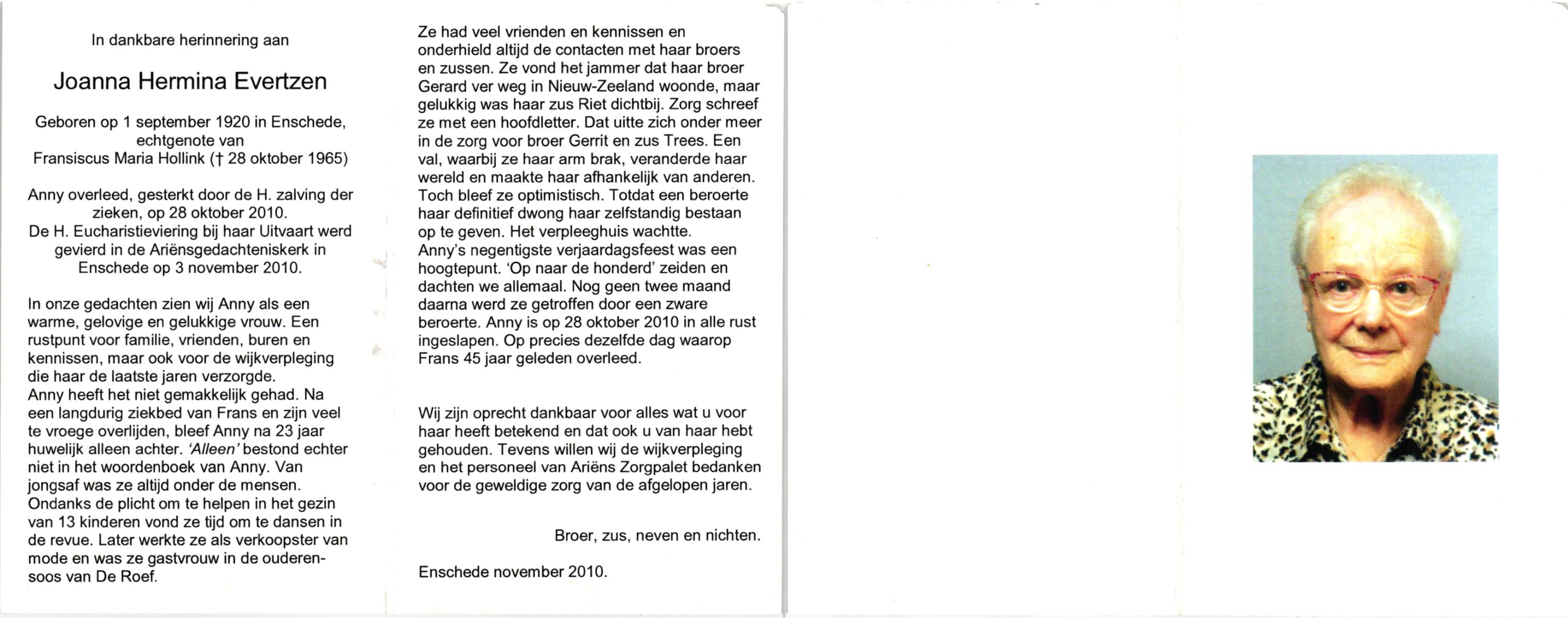 EVERTZEN, , Joanna Hermina, geboren op 1-9-1920 te Enschede, overleden op 28-10-2010 te Enschede op 90-jarige leeftijd.