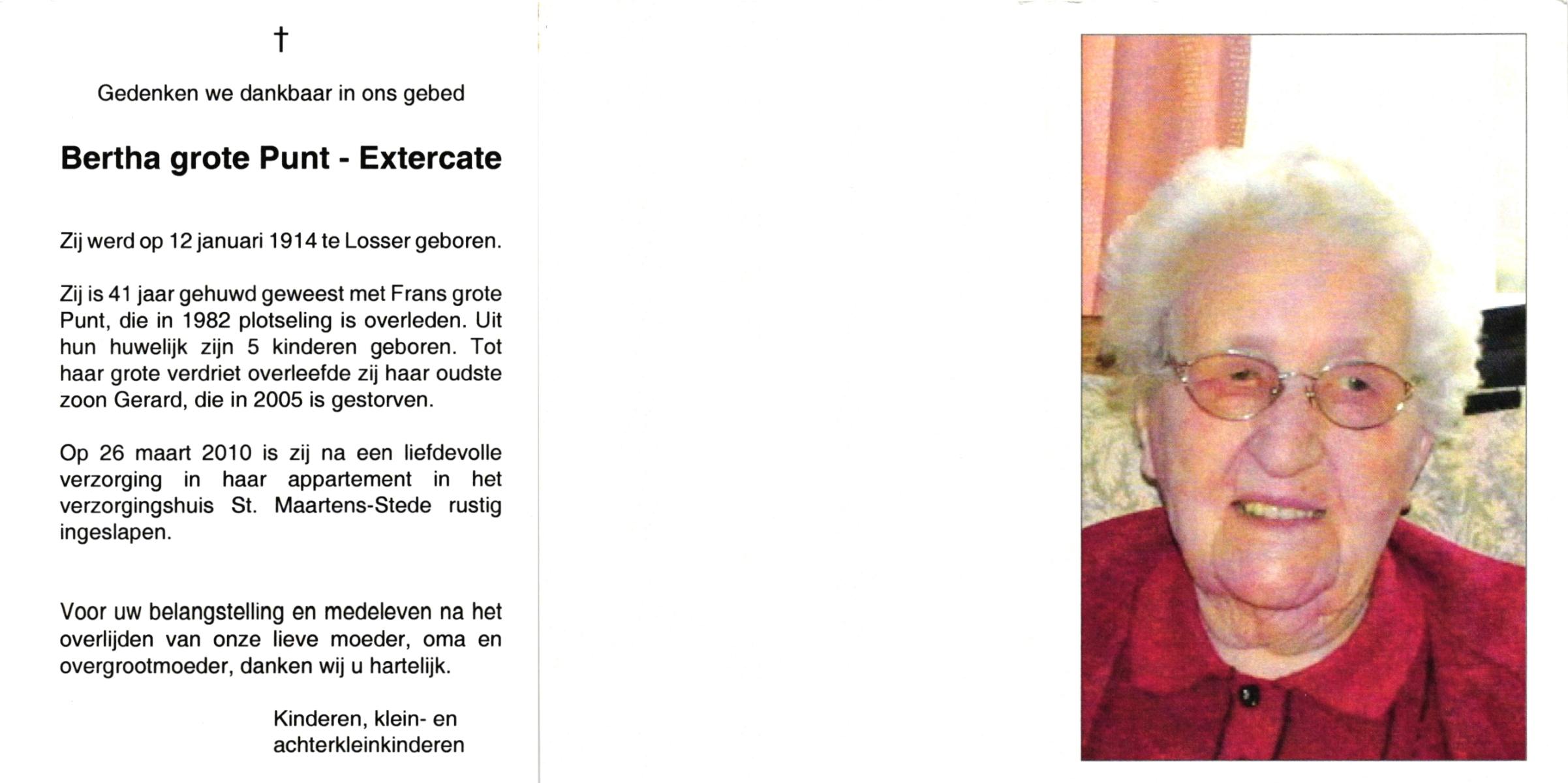 EXTERCATE, , Bertha, geboren op 12-1-1914 te Losser, overleden op 26-3-2010 te Losser op 96-jarige leeftijd.
