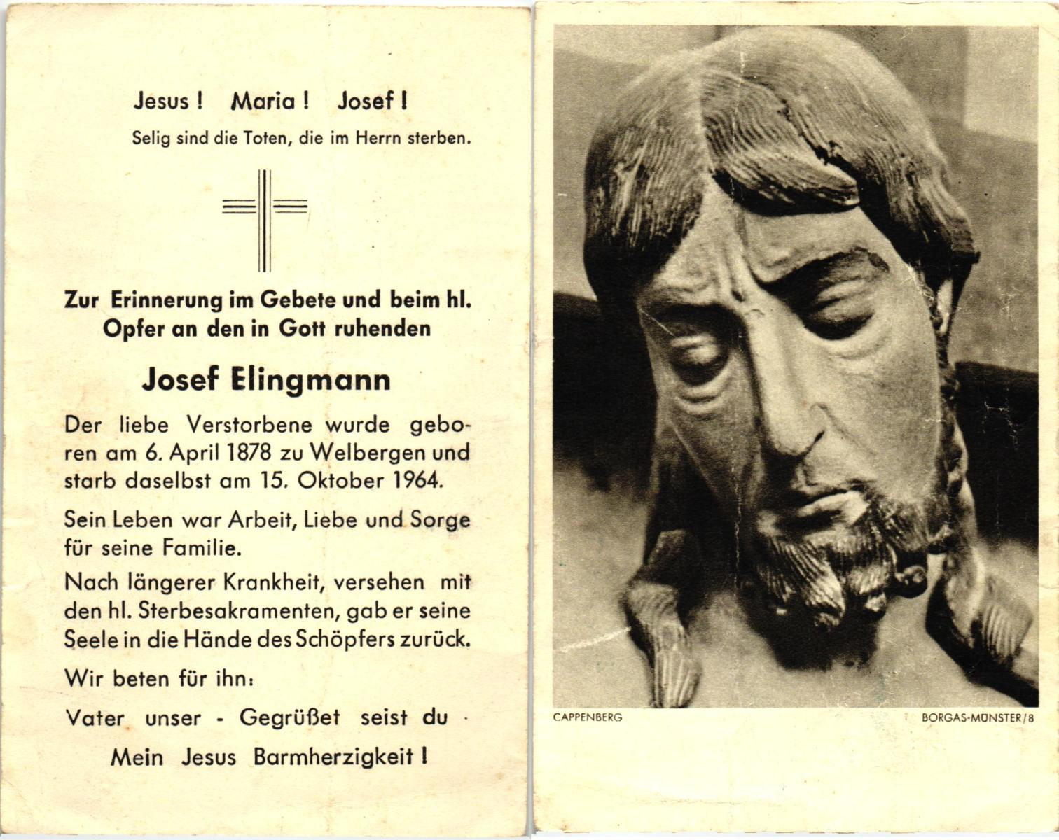 ELINGMANN, Josef, geboren op 06-04-1878 te Welbergen, Dld, overleden op 15-10-1964 op 86-jarige leeftijd.