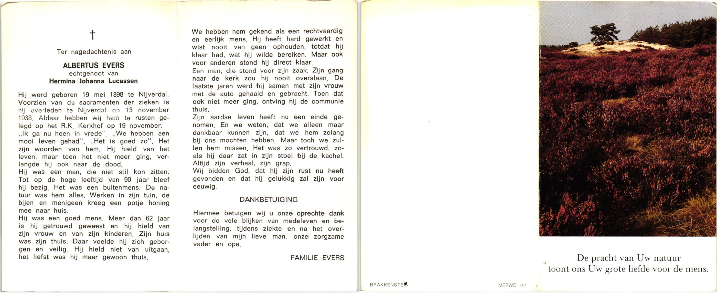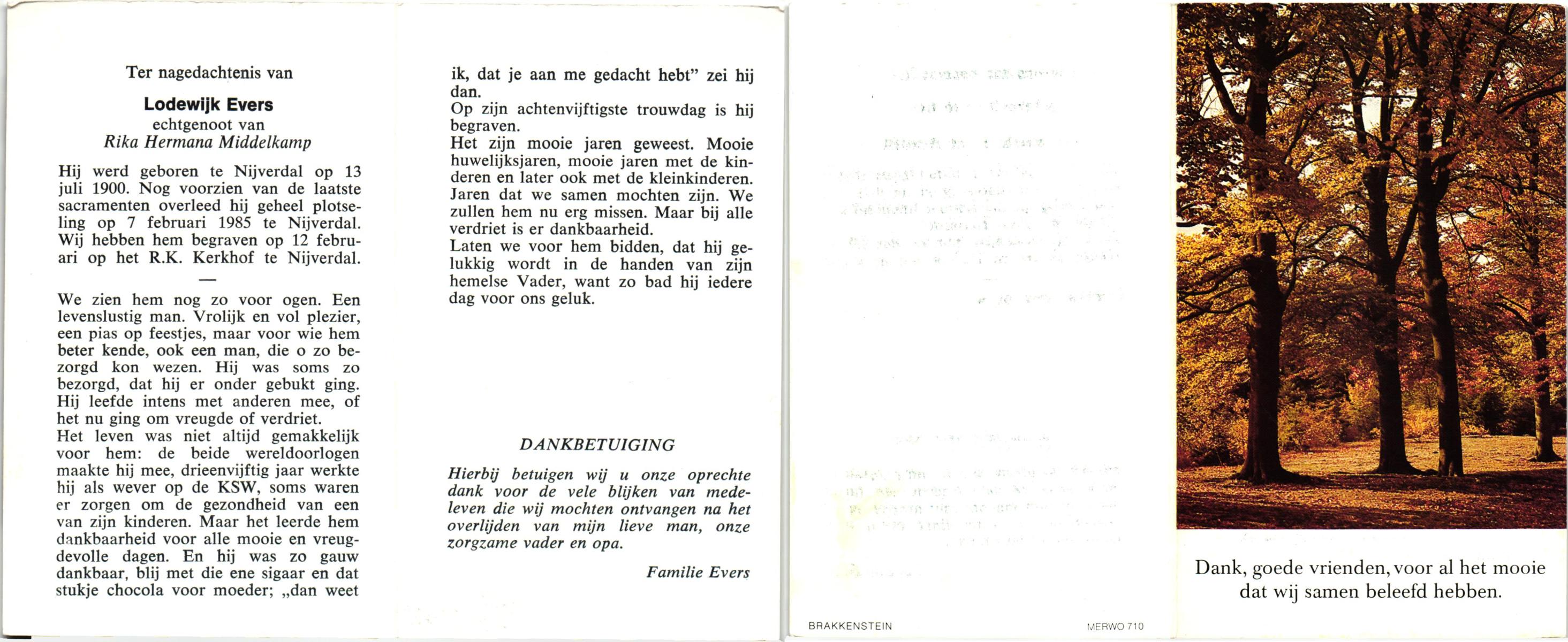 EVERS, Lodewijk, geboren op 13-7-1900 te Hellendoorn, Nijverdal, overleden op 7-2-1985 te Hellendoorn, Nijverdal op 84-jarige leeftijd, begraven op 12-2-1985 te Hellendoorn, Nijverdal. rk.