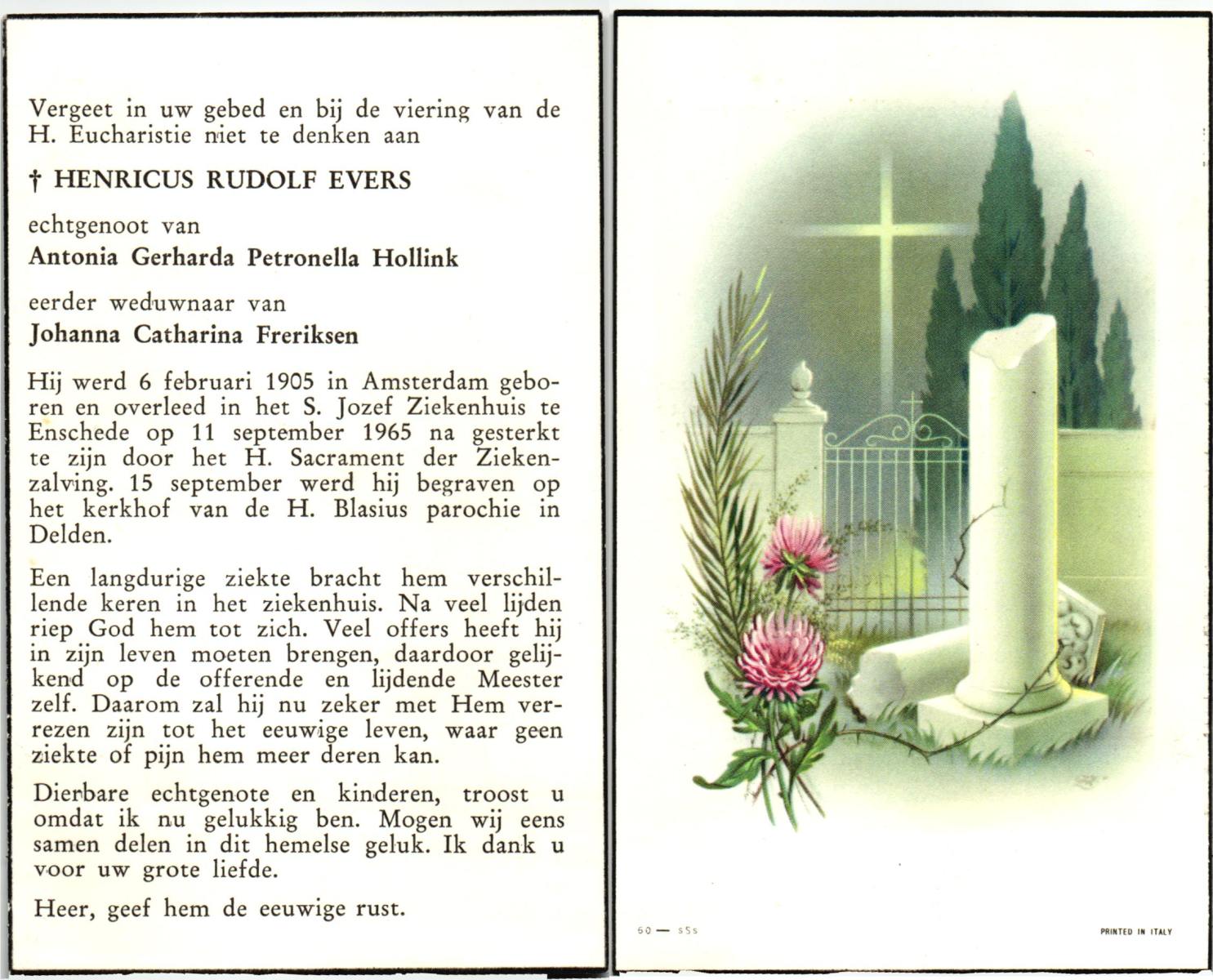 EVERS, Henricus Rudolf, geboren op 6-2-1905 te Amsterdam, overleden op 11-9-1965 te Enschede, ziekenhuis op 60-jarige leeftijd, begraven op 15-9-1965 te Delden.