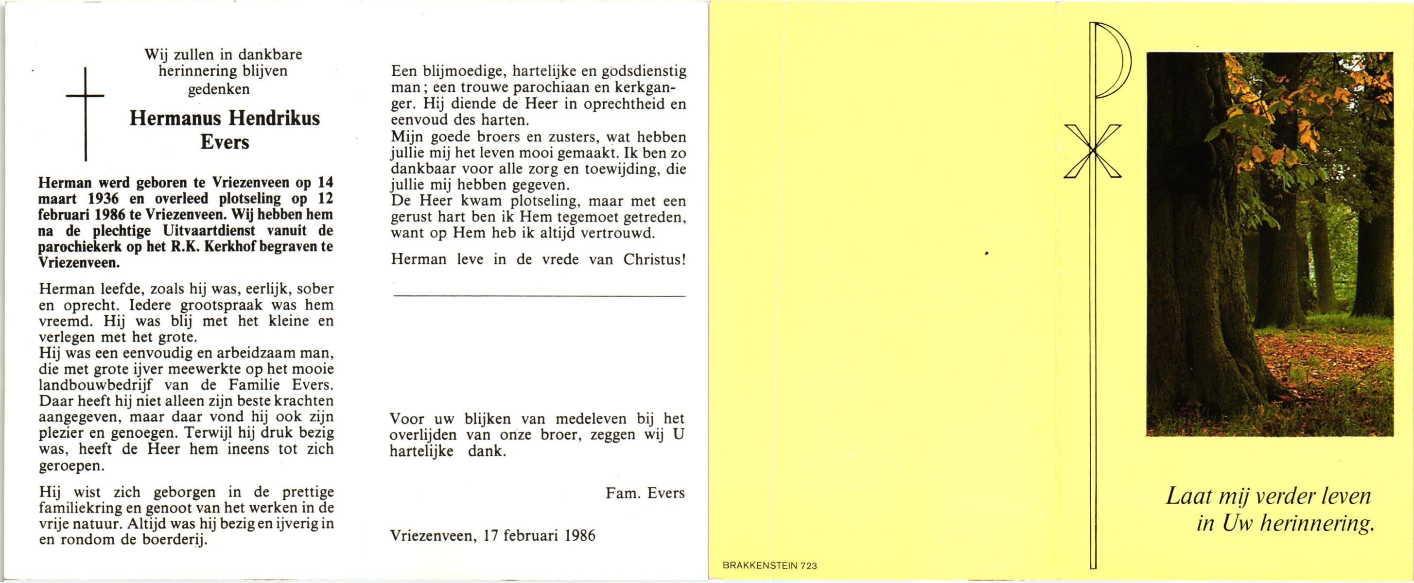 EVERS, Hermanus Hendrikus, geboren op 14-3-1936 te Vriezenveen, overleden op 12-2-1986 te Vriezenveen op 49-jarige leeftijd, begraven te Vriezenveen.