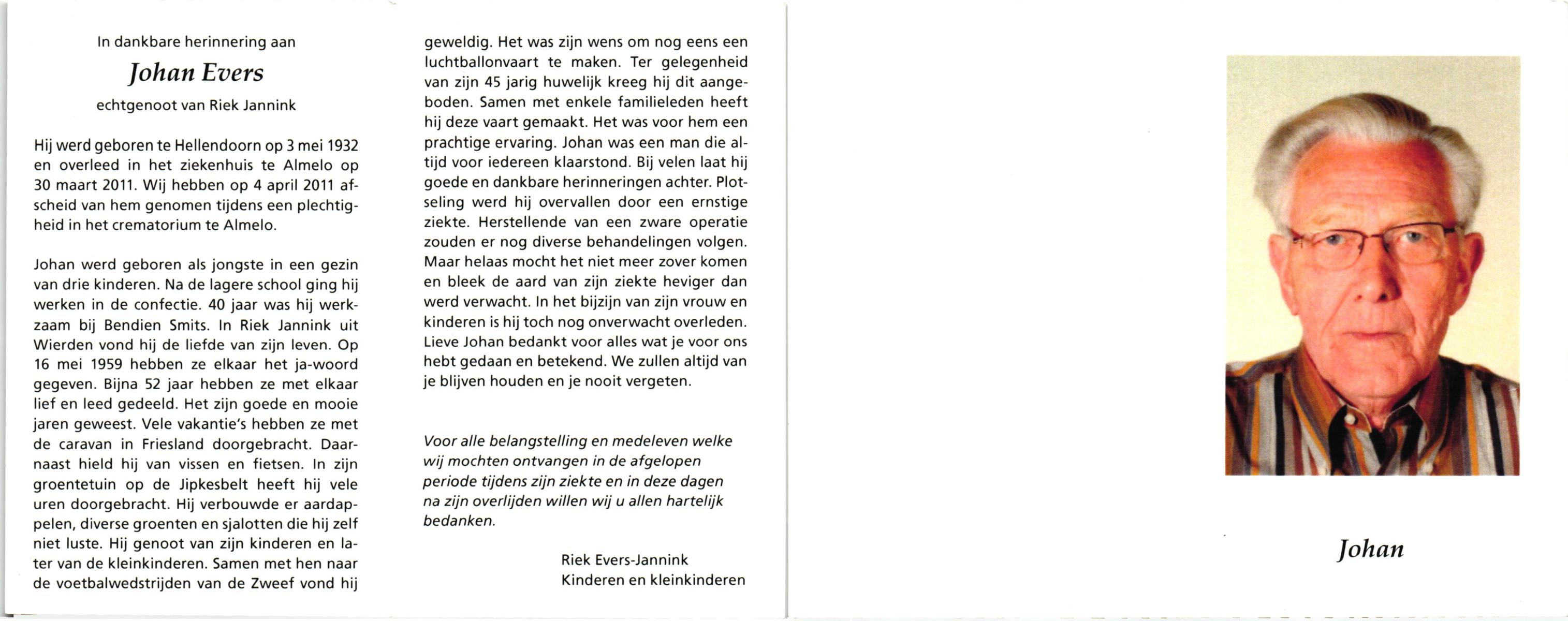 EVERS, Johan, geboren op 3-5-1932 te Hellendoorn, overleden op 30-3-2011 te Almelo, ziekenhuis op 78-jarige leeftijd, gecremeerd op 4-4-2011 te Almelo.