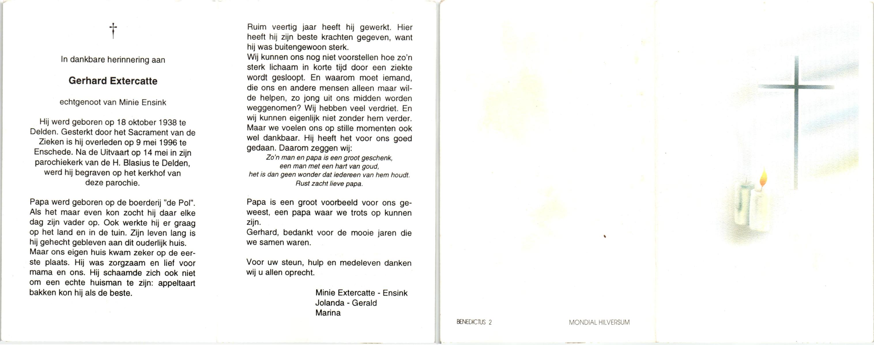 EXTERCATTE, Gerhard, geboren op 18-10-1938 te Delden, overleden op 9-5-1996 te Enschede op 57-jarige leeftijd, begraven op 14-5-1996 te Delden.