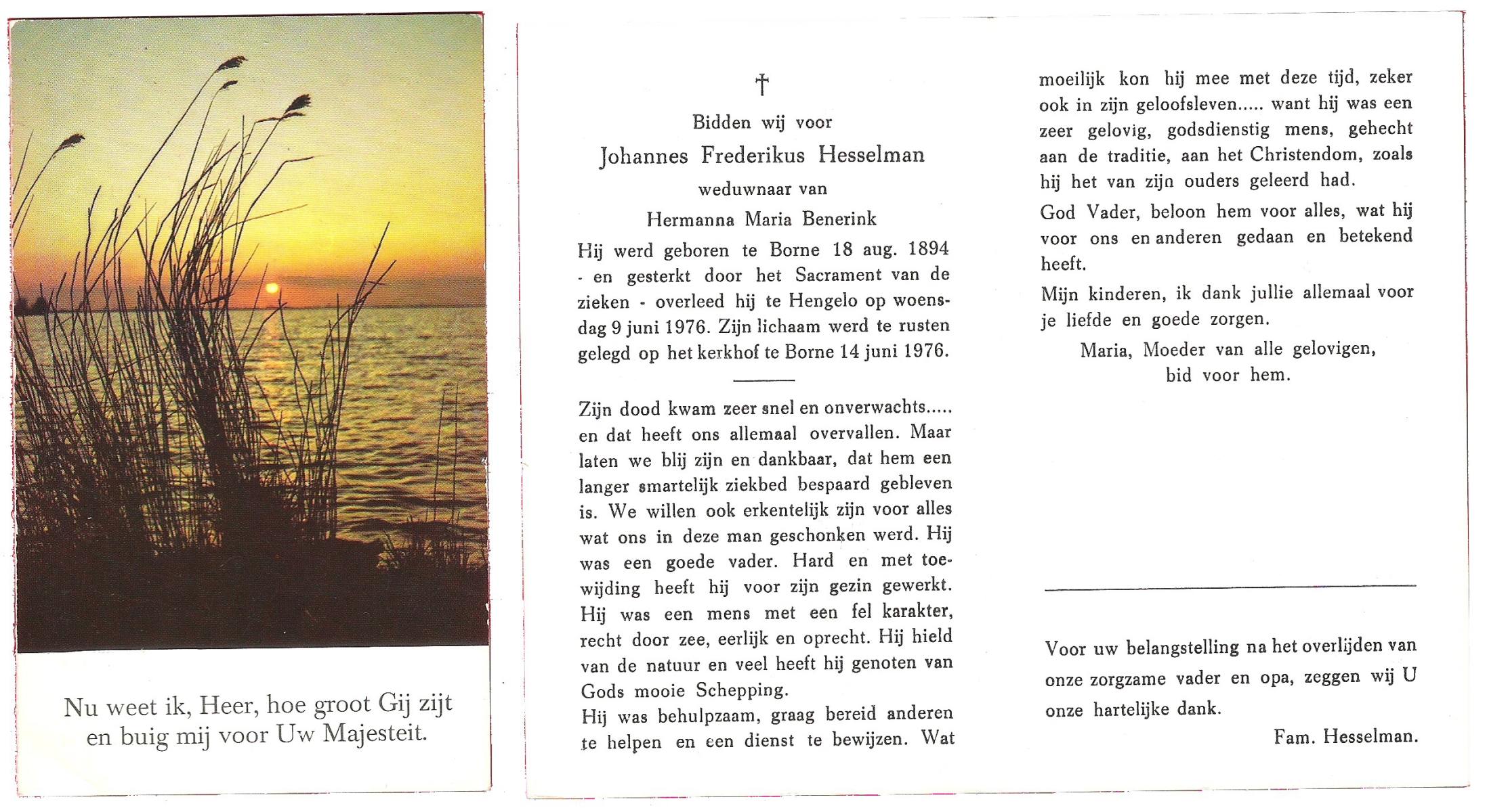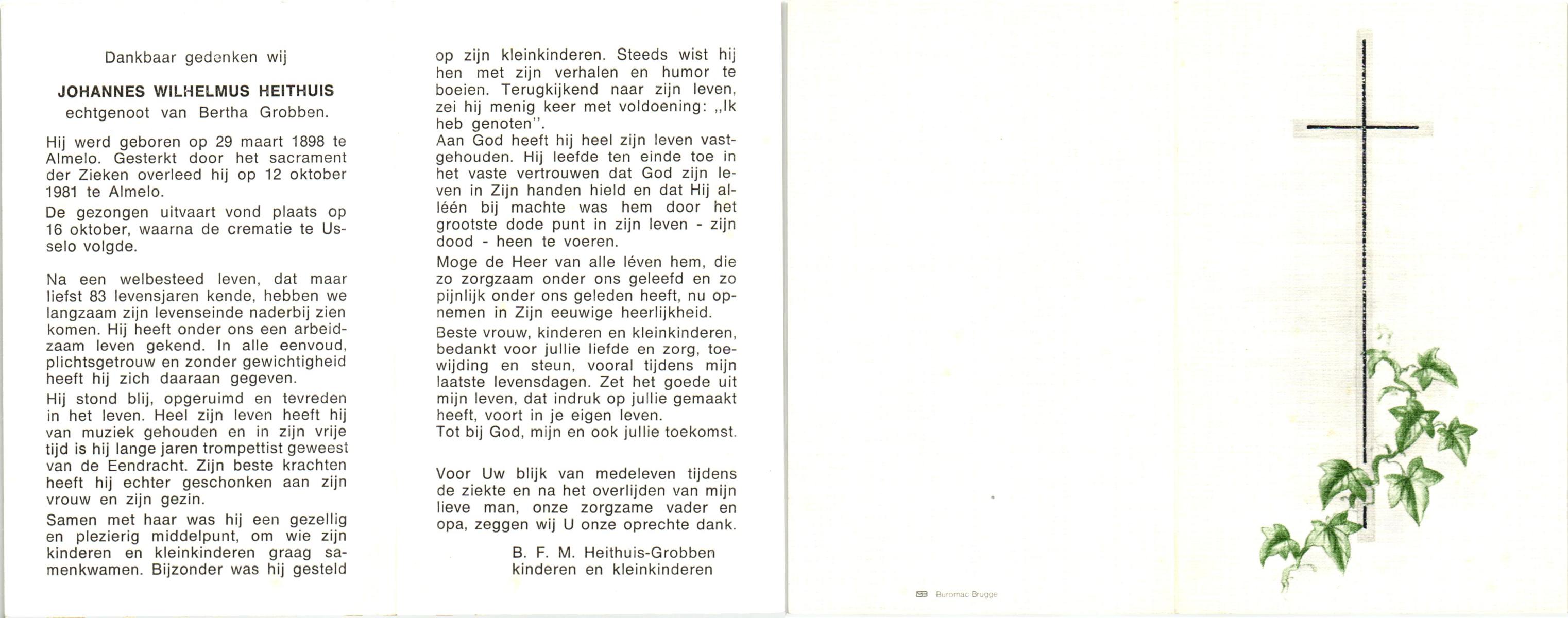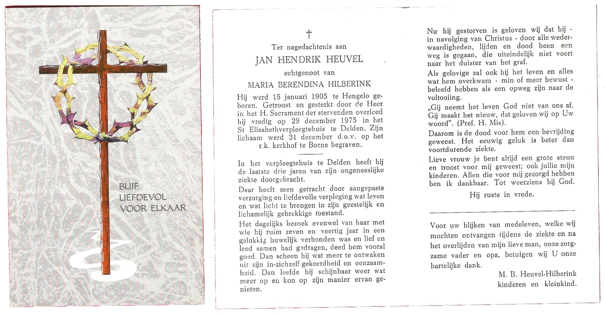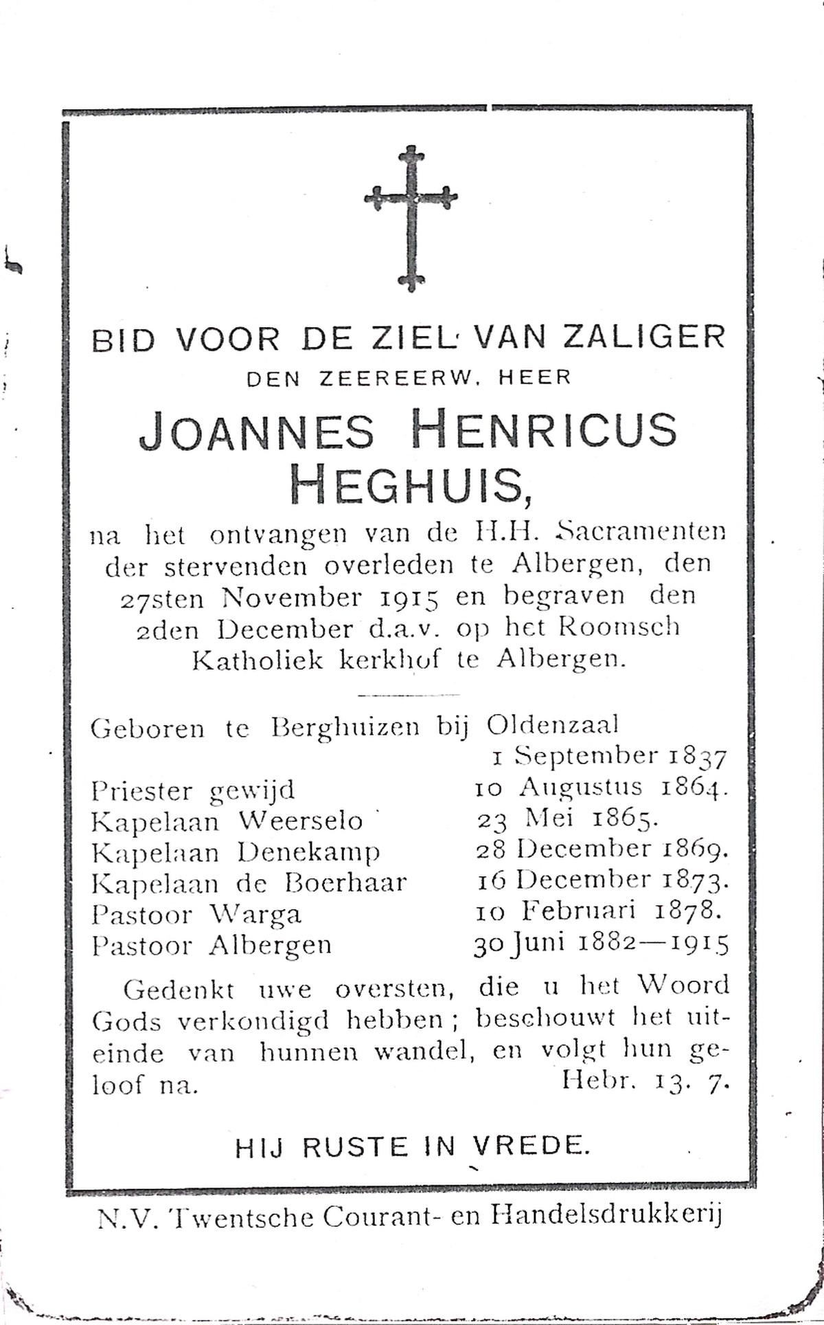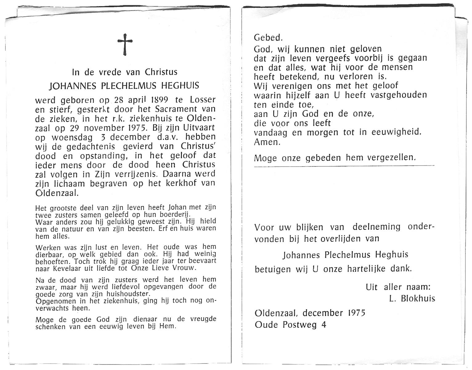 HEGHUIS, Johannes Plechelmus, geboren op 28-04-1899 te Losser, overleden op 29-11-1975 te Oldenzaal op 76-jarige leeftijd, begraven op 3-12-1975 te Oldenzaal.