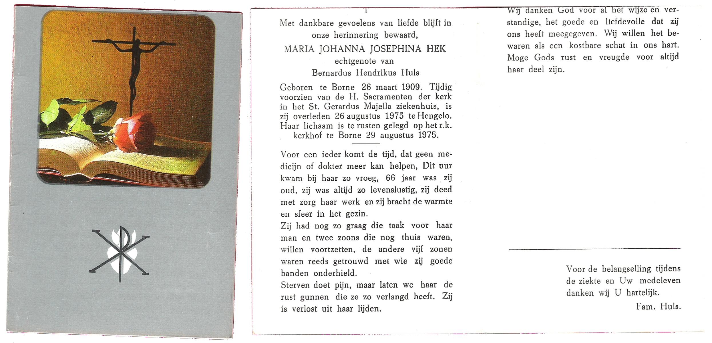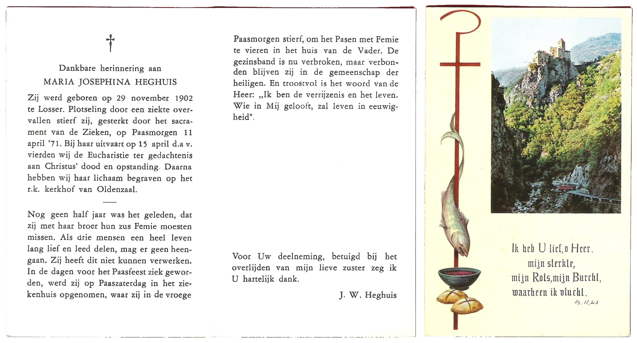 HEGHUIS, Maria Josephina, geboren op 29-11-1902 te Losser, overleden op 11-4-1971 op 68-jarige leeftijd, begraven op 15-4-1971 te Oldenzaal R.K.kekrhof.